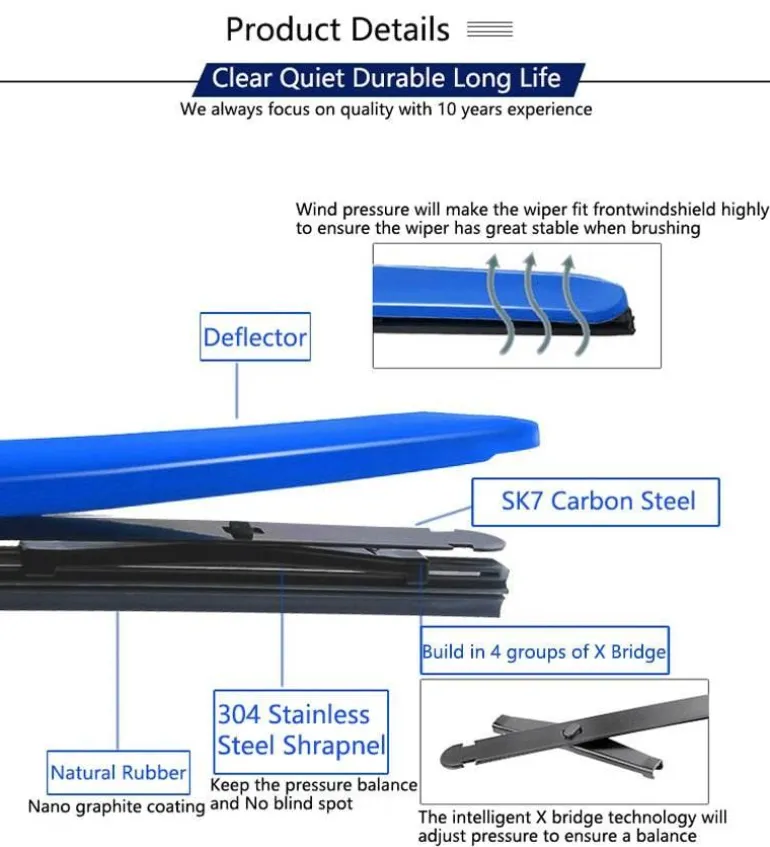 Erleben Sie sanftes und streifenfreies Reinigen, selbst bei schwierigen Wetterbedingungen wie starkem Regen oder Schnee. Die Wischerblätter sind auf optimale Leistung ausgelegt und sorgen für klare Sicht während der Fahrt. Sie bestehen aus strapazierfähigem Silikon oder Gummi und sind resistent gegen Risse, Splitter und Verblassen. So behalten sie dauerhaft ihr strahlendes Aussehen.