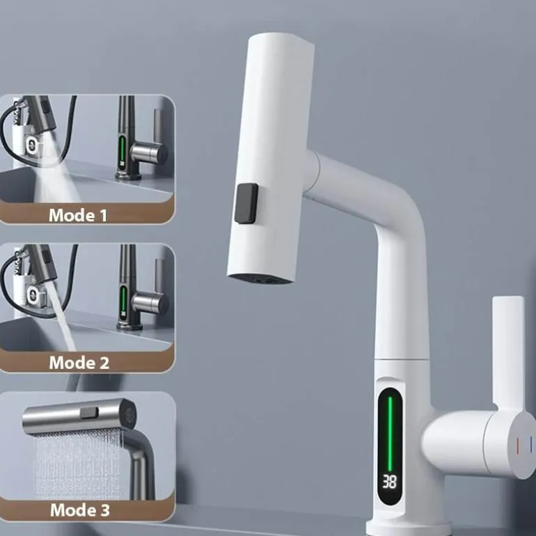 Werten Sie Ihr Zuhause mit dem modernen, eleganten Wasserfall-Wasserhahn mit praktischer Temperaturanzeige auf. Dieser Wasserhahn vereint Eleganz und Funktionalität und ist somit die ideale Ergänzung für Küche und Bad. Sein modernes Design, ergänzt durch den faszinierenden Wasserfall, schafft eine beruhigende Atmosphäre, während die integrierte Temperaturanzeige dafür sorgt, dass Ihr Wasser bei jeder Anwendung die optimale Temperatur hat.