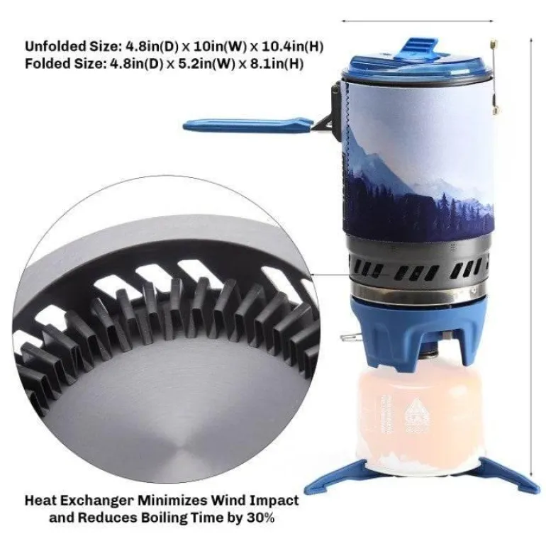 Der aus einer langlebigen Aluminiumlegierung gefertigte Kocher ist leicht und robust zugleich und eignet sich perfekt für Höhenlagen. Er misst im geöffneten Zustand 123 x 254 x 264,5 mm (4,8 x 10 x 10,4 Zoll) und lässt sich auf nur 123 x 132 x 207 mm (4,8 x 5,2 x 8,1 Zoll) zusammenklappen, sodass er problemlos in Ihre Ausrüstung passt. Mit einer leistungsstarken Leistung von 1800 W (6142 BTU/h) verbraucht er effizient 12 g (0,4 oz) Gas pro Liter und bietet so ein hervorragendes Verhältnis zwischen Leistung und Kraftstoffeffizienz.
