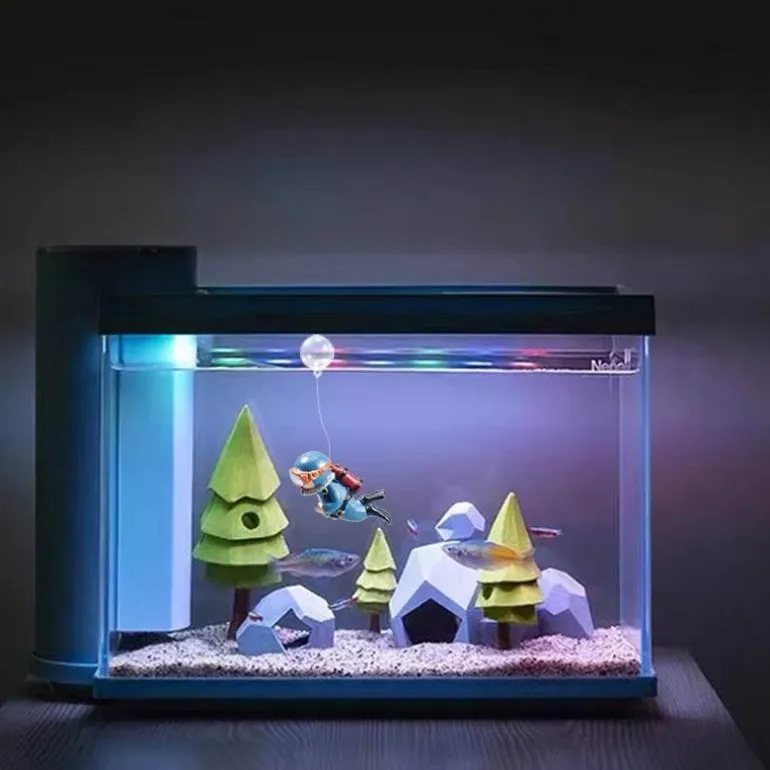 Der Taucher wird von einem schwimmenden Ball und einem transparenten Draht begleitet, der ihn schweben lässt und Ihrem Aquarium eine einzigartige Dynamik verleiht. Dieses Stück bringt nicht nur Leben in Ihr Aquarium, sondern unterhält auch Ihre Fische und weckt ihre Neugier, während sie um ihn herumschwimmen.