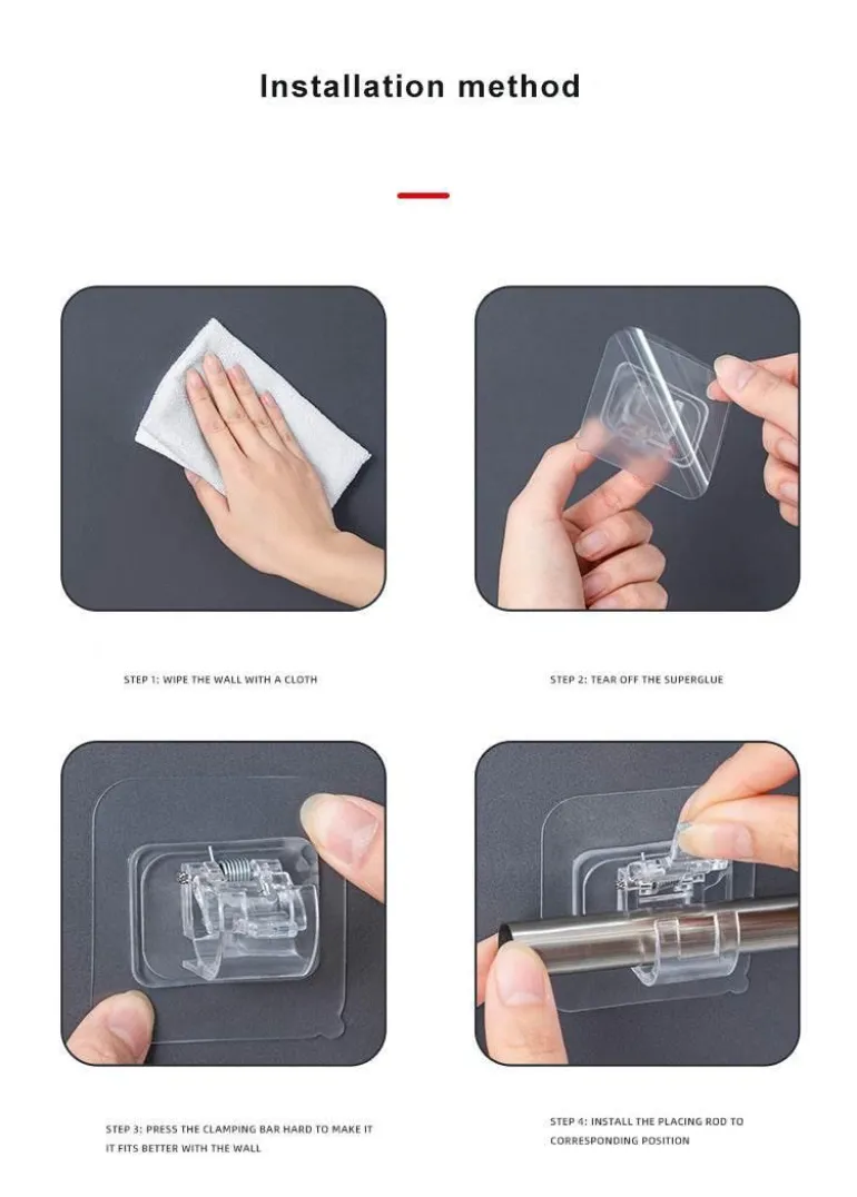 Die Montage ist unkompliziert und erfordert kein Werkzeug. Wischen Sie die Wand einfach trocken, ziehen Sie die Schutzfolie ab und drücken Sie den Halter fest. Dieser Gardinenstangenhalter aus hochwertigem ABS und Edelstahl ist robust, langlebig und wasserdicht und hat eine maximale Tragkraft von 5 kg pro Paar. Seine hervorragenden Hafteigenschaften sorgen dafür, dass er auch in feuchten Umgebungen wie Badezimmern sicher an seinem Platz bleibt.