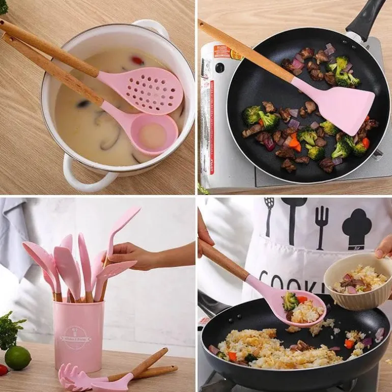 Erleben Sie die Vielseitigkeit unseres Silikon-Küchenutensilien-Sets mit eleganten Holzgriffen – ein Must-have für Ihre kulinarische Reise. Hergestellt aus hochwertigem Silikon bieten diese Utensilien eine perfekte Kombination aus Langlebigkeit und ansprechender Optik und eignen sich somit ideal für den täglichen Kochalltag.