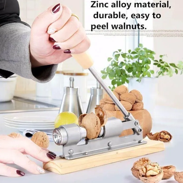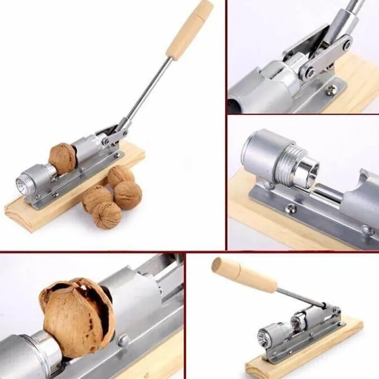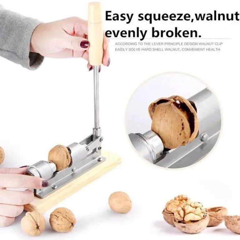 Das einzigartige Design ermöglicht ein schnelleres und einfacheres Knacken von Nüssen mit weicher Schale und sorgt so für ein noch angenehmeres Knabbererlebnis. Die langlebigen und verschleißfesten Materialien aus präzisionsverarbeitetem Nickellegierungsstahl sorgen für lang anhaltende Leistung. Das elegante Metalldesign wird durch einen stabilen Holzsockel ergänzt und vereint modernes Design mit Funktionalität. Der robuste Griff hält hohem Druck stand, ohne sich zu verbiegen und gewährleistet so eine sichere und zuverlässige Handhabung. Die beiden mitgelieferten Gabeln erleichtern das Herauslösen von Nüssen, die in der Schale stecken geblieben sind, während eine Reinigungsbürste hilft, nach Gebrauch alle Nussschalenreste zu entfernen.