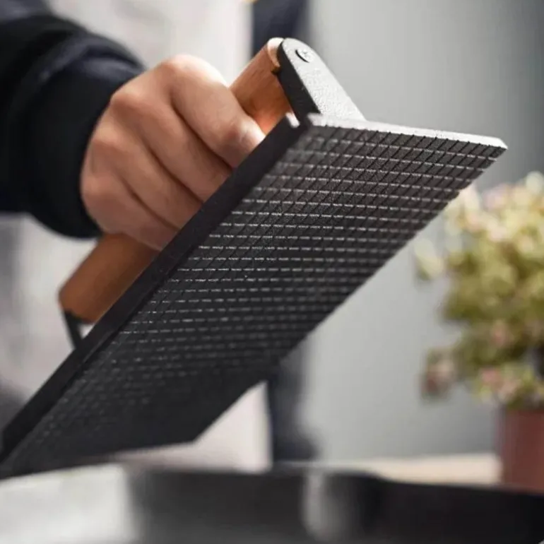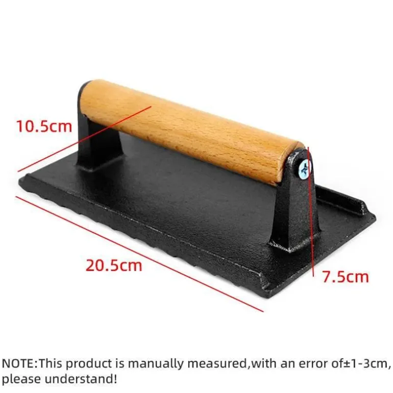 Der robuste Holzgriff liegt gut in der Hand und ermöglicht gleichmäßigen Druck auf verschiedene Fleischstücke, darunter Ribeye, Filet Mignon und Hähnchenbrust. Das durchdachte Design sorgt nicht nur für attraktive Grillstreifen, sondern versiegelt auch Aromen und Säfte – für ein stets saftiges Grillerlebnis.