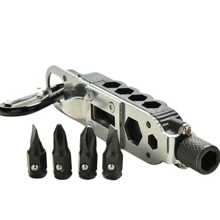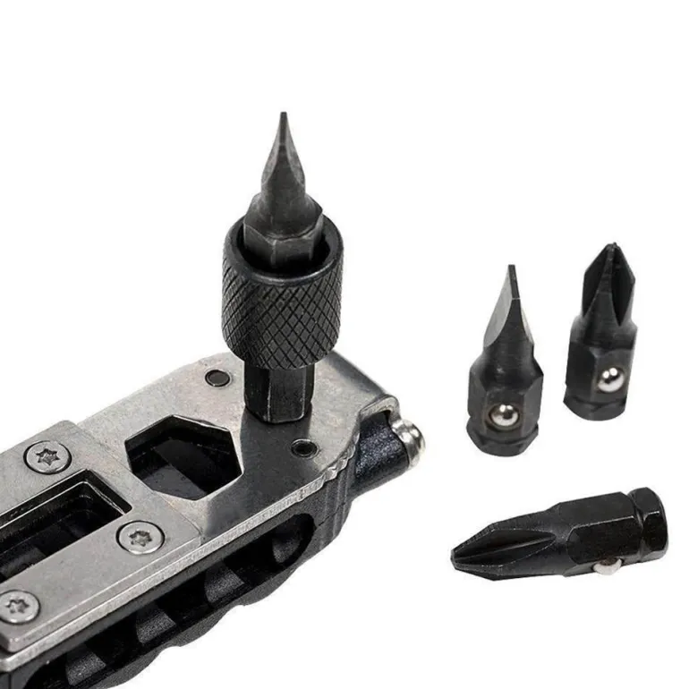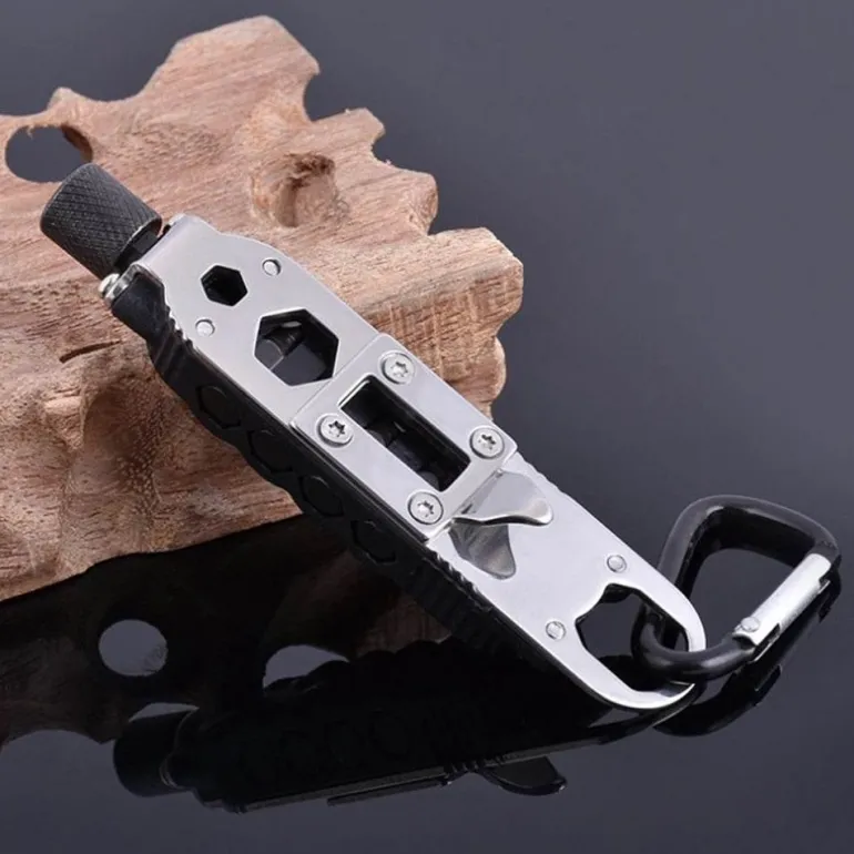 Das Werkzeug umfasst einen kleinen und einen großen Schraubendreher, einen großen und einen kleinen Kreuzschlitzschraubendreher, eine weiße LED-Beleuchtung für Sichtbarkeit bei schwachem Licht, zwei Arten von Sechskantschlüsseln, einen Flaschenöffner und einen Schnellhaken zur einfachen Befestigung.
