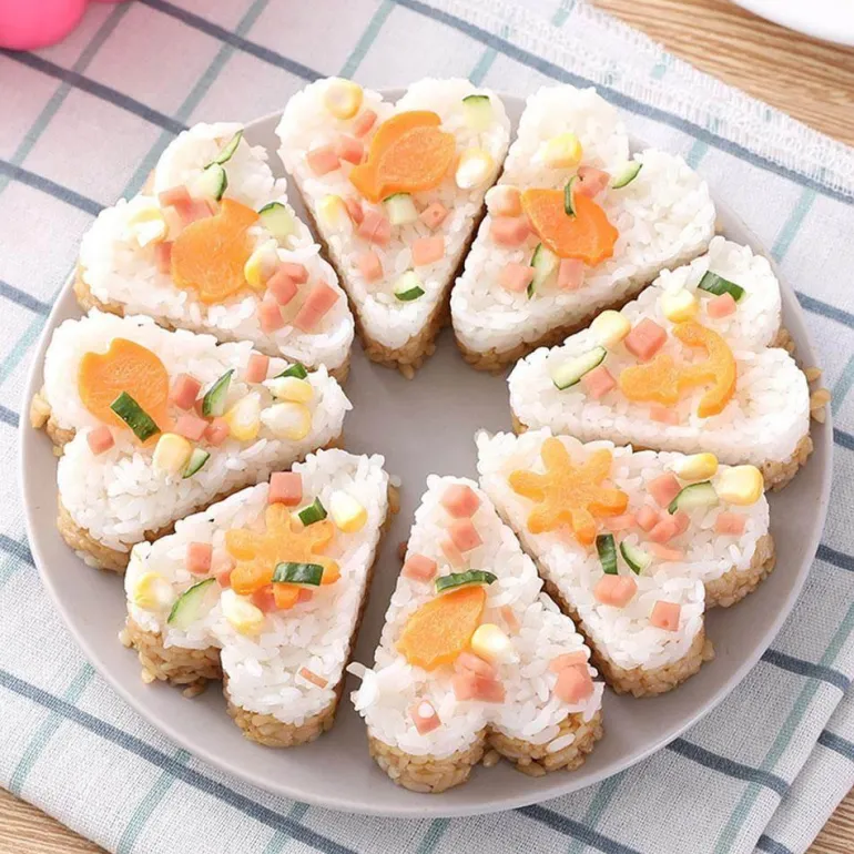 Mit diesem Set sind die Möglichkeiten endlos: Sie können damit Sushi-Reis formen, frischen Fisch, Lachs, Gemüse, Eier oder Schinken darauf schichten und zu Hause wunderschönes, köstliches Sushi zubereiten. Außerdem können Sie Ihre Dessert-Künste mit der Form für die Zubereitung köstlicher Puddings ausprobieren.