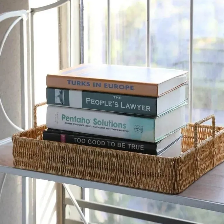 Werten Sie die Einrichtung Ihres Zuhauses mit der minimalistischen Eleganz des Tabletts mit Rattan-Griff auf, das sich nahtlos in Ihr Zuhause einfügt und Ihren Organisationsanforderungen gerecht wird.