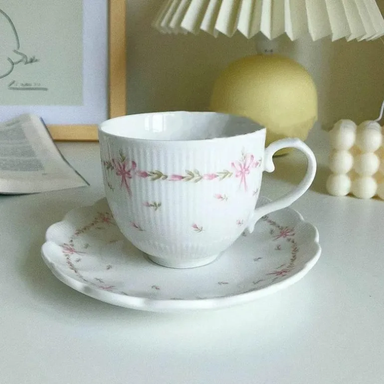 Dieses exquisite Set besteht aus Tassen und Untertassen, die mit einer aufwendigen Aufglasurtechnik verziert sind. Sie zeigen einen bezaubernden großen Rosenkranz, umrahmt von zarten kleineren Rosenschleifen. Die floralen Muster sind nicht nur optisch interessant, sondern schaffen auch eine einladende Atmosphäre für jeden Anlass und machen jeden Schluck zu einem Genuss.