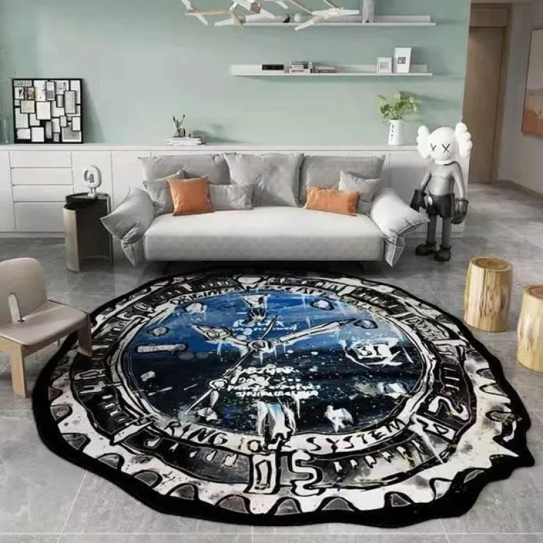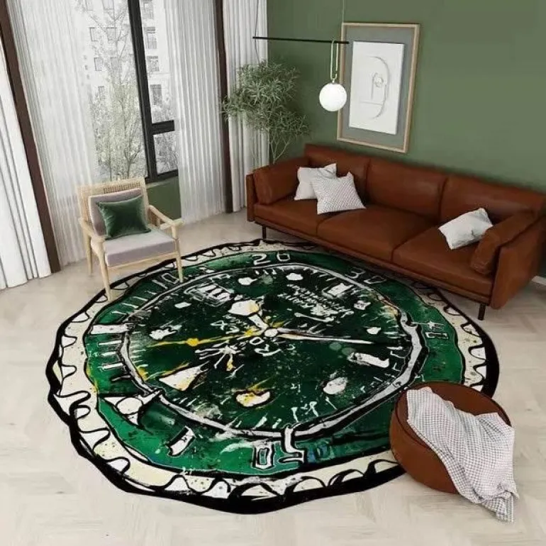 Verschönern Sie Ihre Inneneinrichtung mit dem Rolex-inspirierten Zifferblatt-Teppich, einer dekorativen Matte, die Eleganz verkörpert. Dieser sorgfältig gefertigte Teppich präsentiert eine authentische Nachbildung eines klassischen Rolex-Zifferblattdesigns.