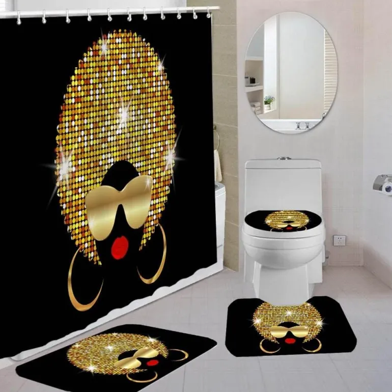 Dieses Set enthält einen wasserdichten Duschvorhang und drei passende Toilettenmatten: einen flauschigen Badvorleger, eine U-förmige Bodenmatte und einen O-förmigen Toilettendeckelbezug.
