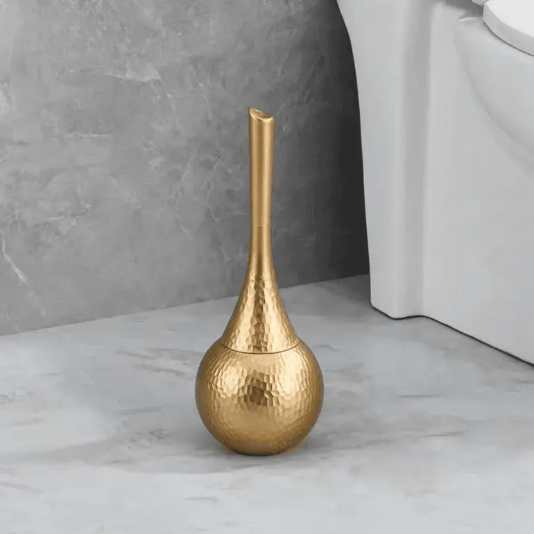 Upgrade your bathroom with this modern toilet brush, designed to complement a contemporary aesthetic while providing ease of use. The brush is elegantly housed in a bulbous, hand-hammered base that not only looks stylish but also secures the brush in place when not in use.
