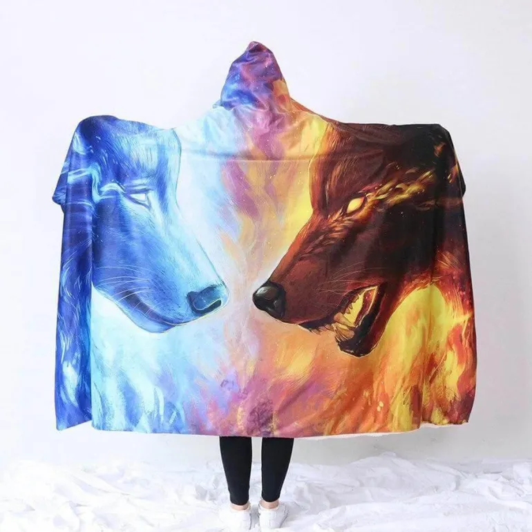 Die Fire and Ice Fleecedecke mit Kapuze besticht durch ein faszinierendes Design von JoJoesArt. Sie zeigt zwei Wölfe in einem dramatischen Duell zwischen Flammen und Eis und verleiht Ihrem Wohlfühlerlebnis eine einzigartige Note. Genießen Sie Wärme und Stil, während Sie sich in diese vielseitige und kunstvolle Kapuzendecke hüllen.