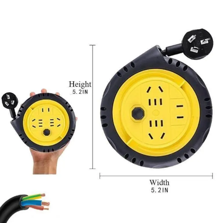 Diese tragbare Verlängerungskabeltrommel ist auf Komfort und Effizienz ausgelegt. Ihre kompakte Größe ermöglicht eine einfache Lagerung und macht sie zur perfekten platzsparenden Lösung für jede Umgebung. Der durchdachte Aufbewahrungsschacht ermöglicht eine problemlose Kabelführung und verhindert ein Verklemmen beim Auf- und Abwickeln des Kabels.