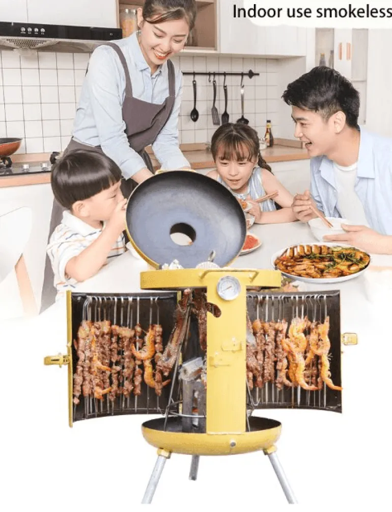 Entdecken Sie die Freude am Kochen im Freien mit unserem tragbaren, rauchfreien All-in-One-Campinggrill. Er wurde für Outdoor-Fans entwickelt, die gerne grillen und die Natur genießen. Dieser robuste Grill aus hochwertigem Edelstahl ist mobil und verfügt über einen integrierten Griff und praktische Haken für den einfachen Transport. Dank seines kompakten und leichten Designs können Sie ihn mühelos überallhin mitnehmen und aufstellen, wohin Ihre Abenteuer Sie auch führen.