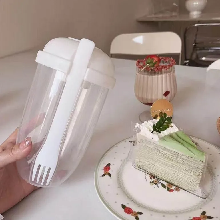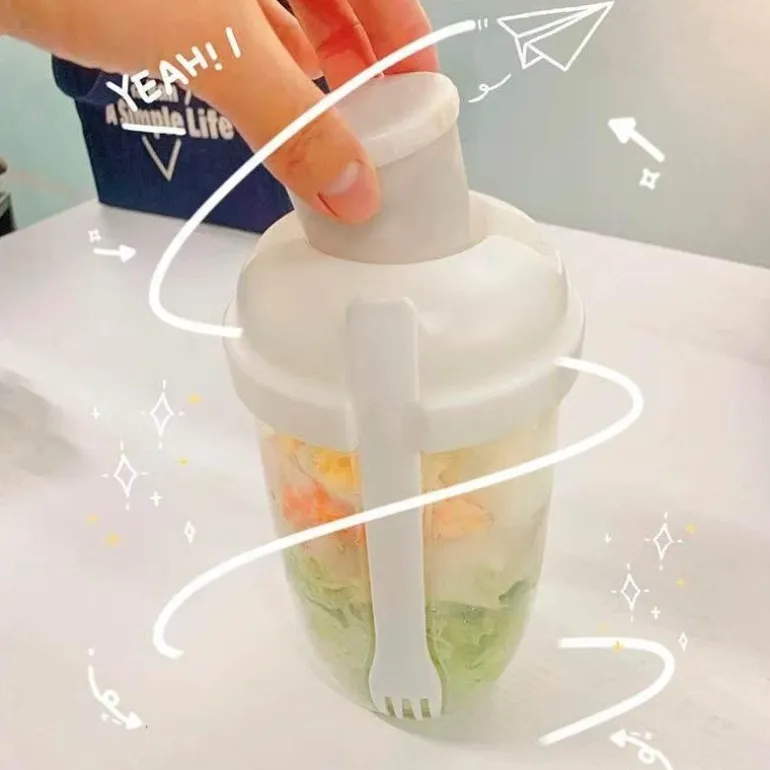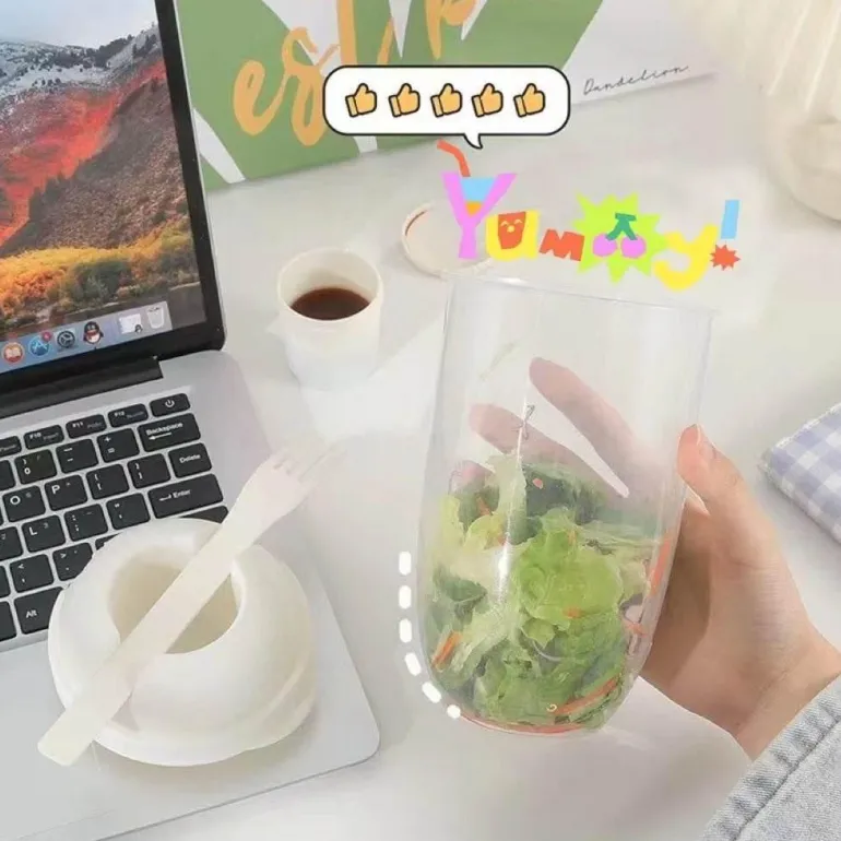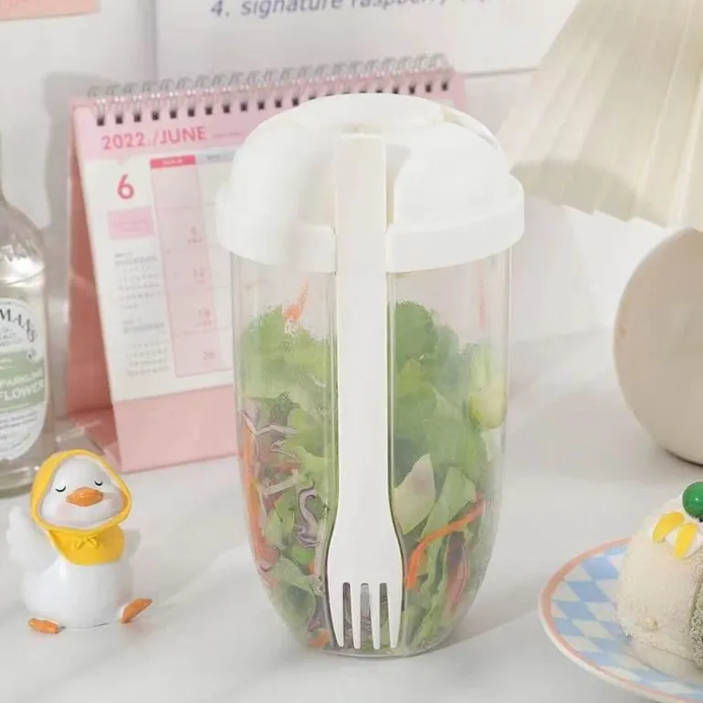 Jeder Becher verfügt über eine integrierte Gabel und einen Halter für Salatdressing, sodass Sie Ihre Mahlzeit jederzeit und überall genießen können. Dank seiner kompakten Abmessungen passt er problemlos in die meisten Lunchtaschen und ist somit besonders praktisch für den täglichen Gebrauch.