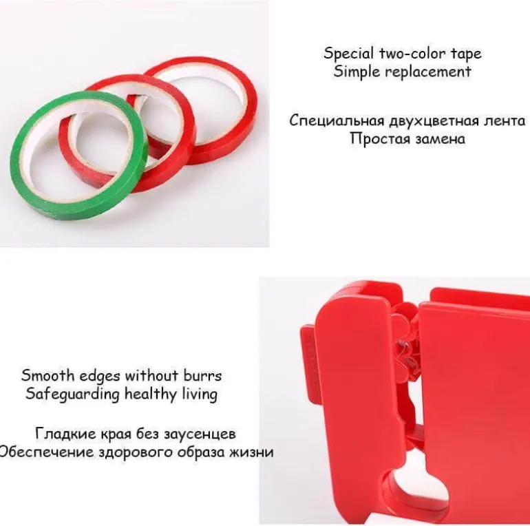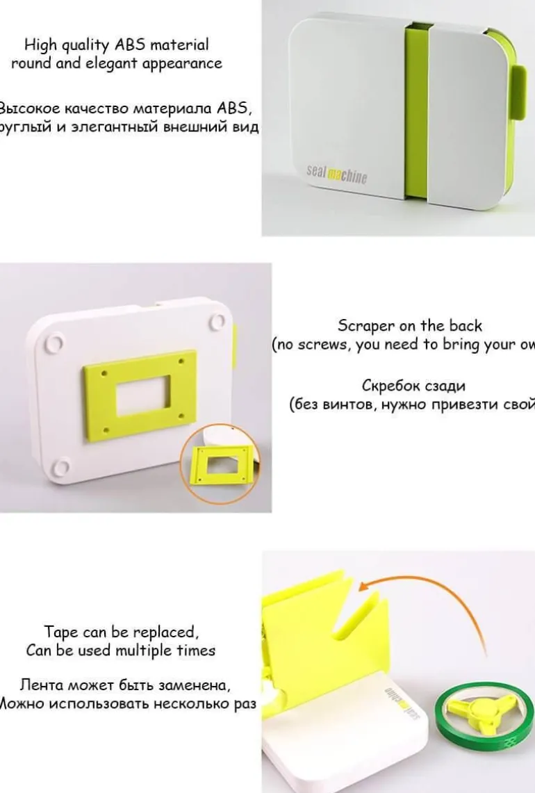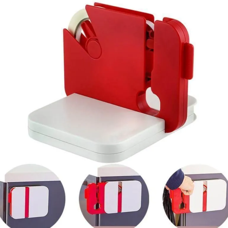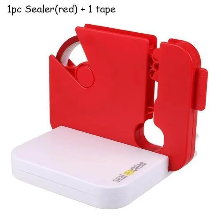 Dieses vielseitige Werkzeug lässt sich einfach an der Seite eines Küchenmöbels befestigen oder im Schrank verstauen, um Platz zu sparen. Die Bedienung des Versiegelers ist unkompliziert; Schritt-für-Schritt-Fotos veranschaulichen das einfache Einlegen des Klebebands. Jedes Gerät enthält 10 Rollen Klebeband für den sofortigen Einsatz.