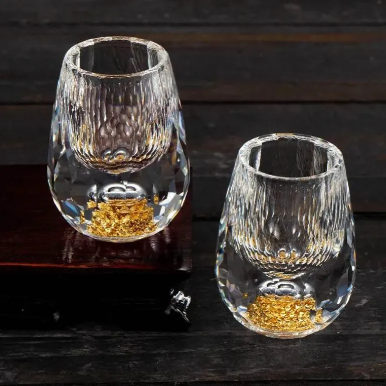 Dieses elegant gefertigte Trinkgeschirr-Set aus Kristallglas ist ein kompaktes Meisterwerk, das das Licht durch seine facettierte Oberfläche wunderschön einfängt und reflektiert, was zu einem faszinierenden Prismeneffekt führt. Sorgfältig eingefasste Goldpartikel am Boden verleihen ihm einen Hauch von Raffinesse und machen es zu einer erlesenen Wahl für den Genuss Ihrer feinsten Spirituosen.