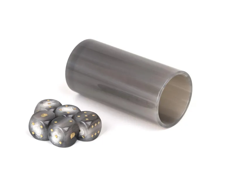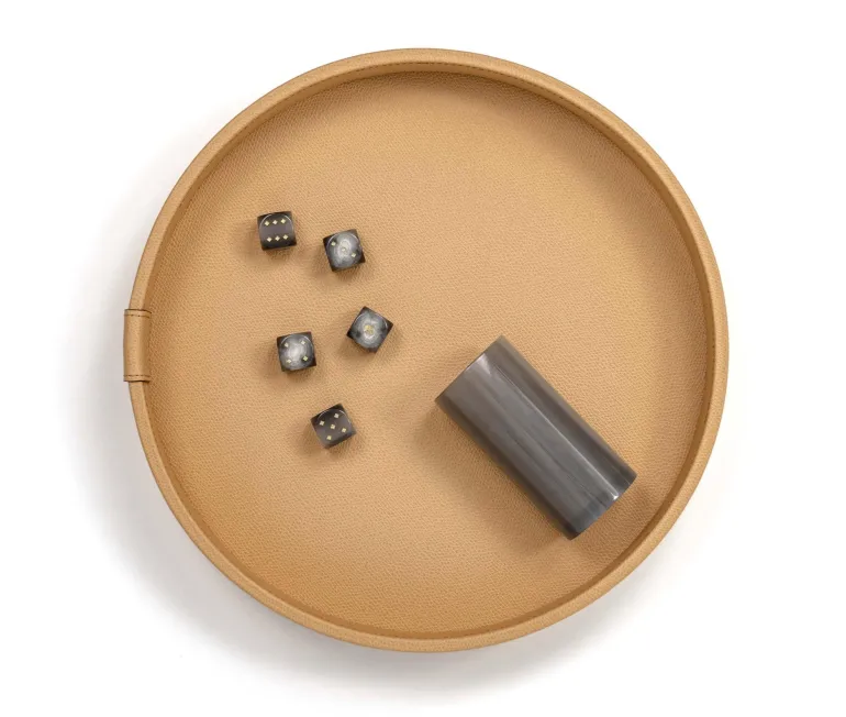 Elevate your game nights with our Gea round tray, crafted from waterproof and scratch-resistant calfskin leather, featuring a non-slip base. This essential design is a refined update on a classic, paired with a custom dice game set. The set includes one shaker and five Pinetti-customized resin dice. Available in a variety of leathers and colors, this piece seamlessly integrates luxury with leisure.