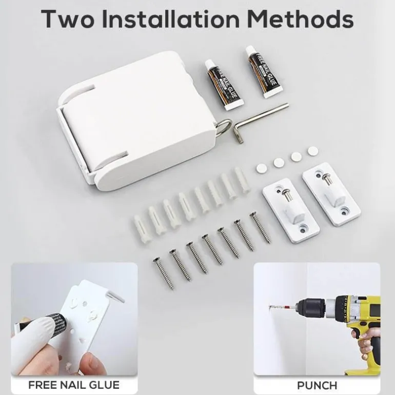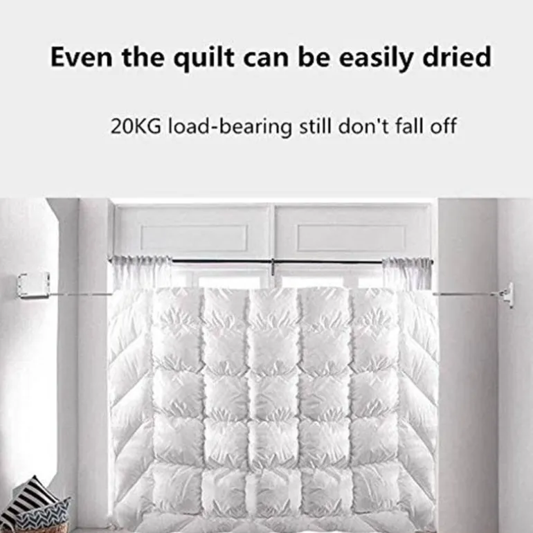 Die Installation ist unkompliziert und bietet zwei Optionen: Die Befestigung erfolgt einfach mit Kleber oder Schrauben. Die 180-Grad-Drehfunktion sorgt für zusätzliche Flexibilität. Die hohe Tragkraft der Wäscheleine sorgt dafür, dass Ihre Kleidungsstücke sicher an ihrem Platz bleiben, sodass Sie sich keine Sorgen machen müssen, dass sie herunterfallen.