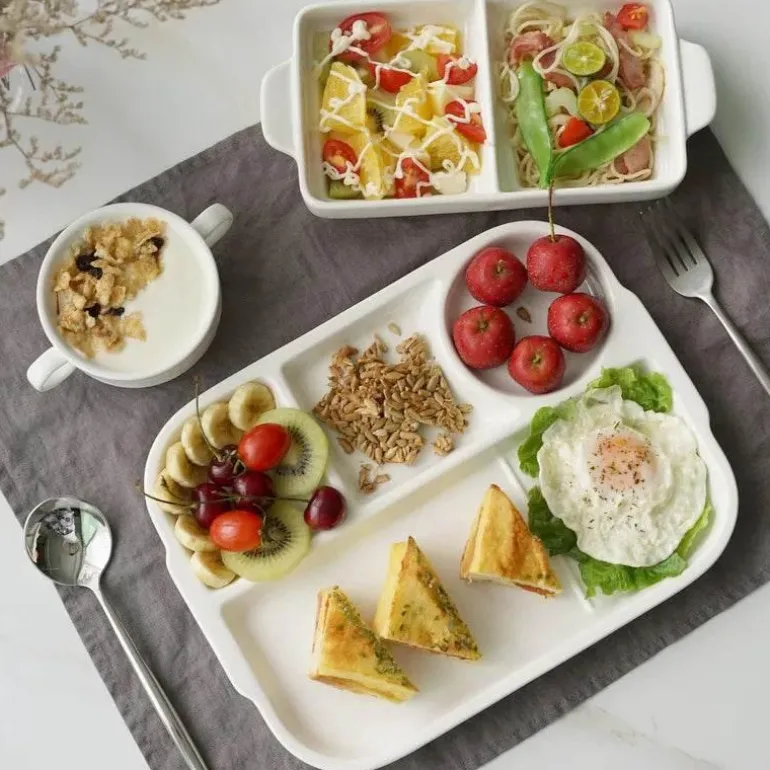Mit seiner schlanken, rechteckigen Form und dem minimalistischen Design passt dieser Teller perfekt zu jedem Tischgedeck. Die Unterteilung bietet die perfekte Lösung zum Trennen verschiedener Speisen und eignet sich ideal zur Portionskontrolle oder zur Präsentation einer köstlichen Auswahl an Snacks.