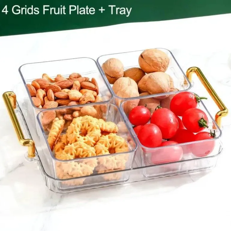 Entdecken Sie das Snacktablett mit 6 Fächern – eine vielseitige und stilvolle Ergänzung für Ihre Küche und Ihr Esszimmer. Dieses sorgfältig gefertigte Obst- und Snacktablett ist in den eleganten Farben Transparent, Grau und Grün erhältlich und wertet jedes Ambiente mühelos auf.