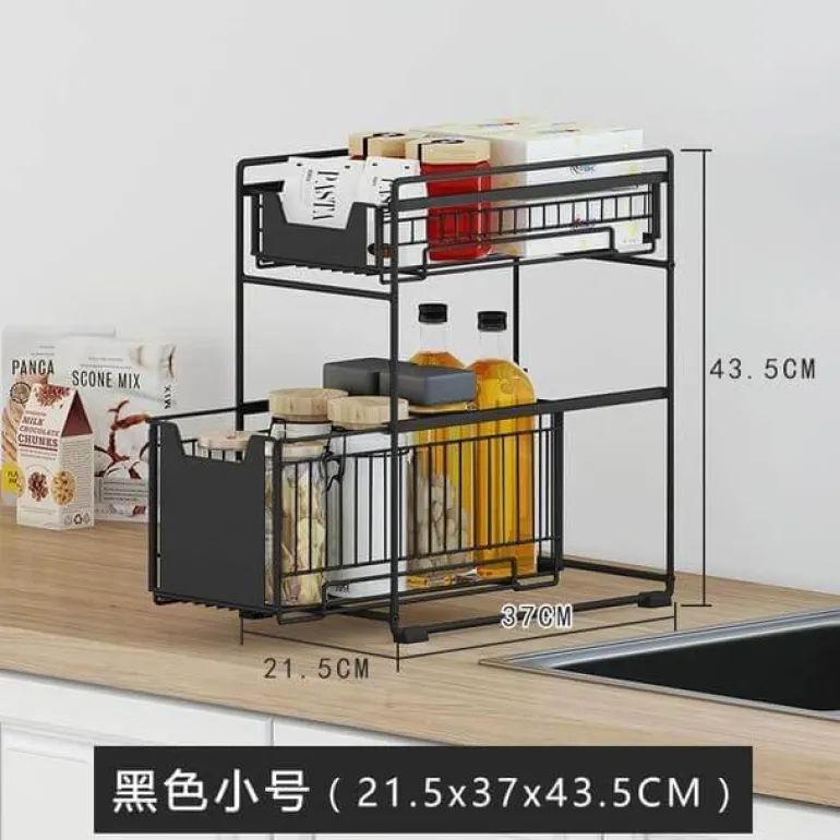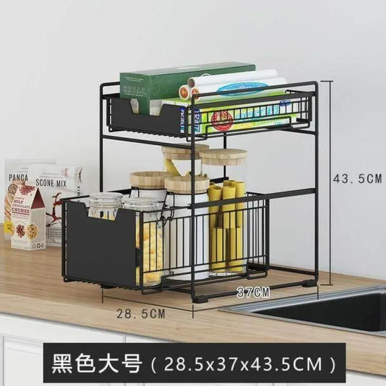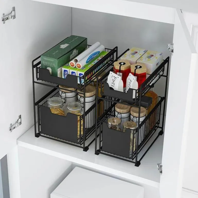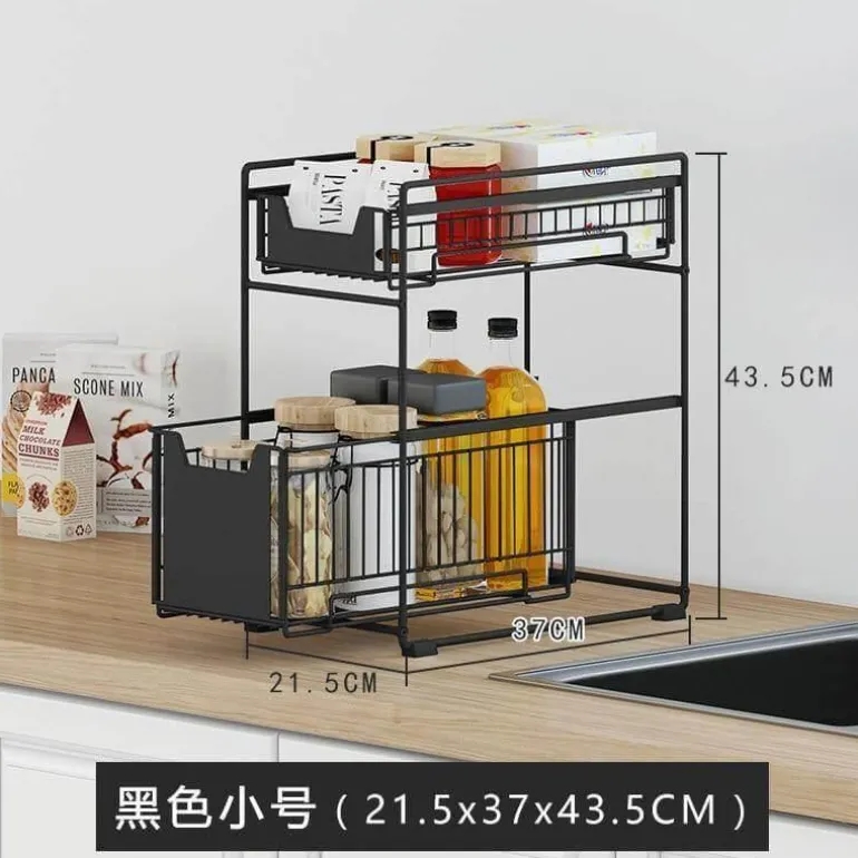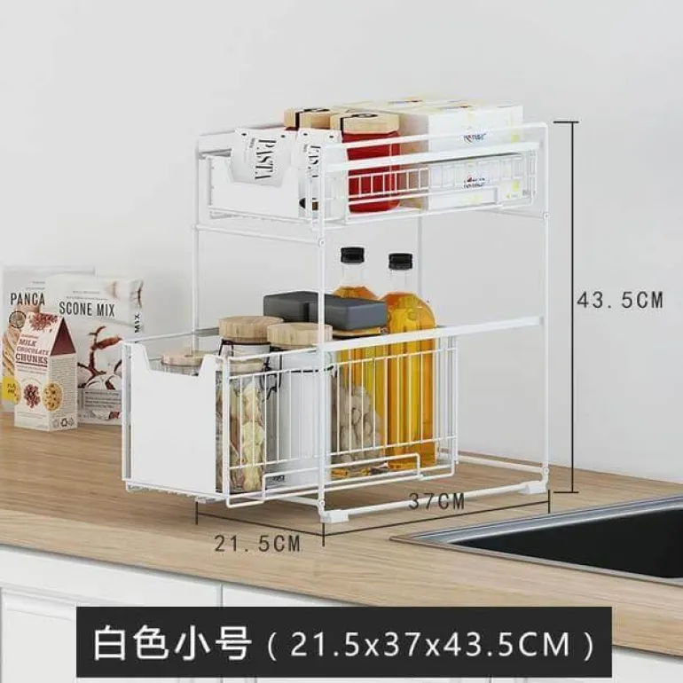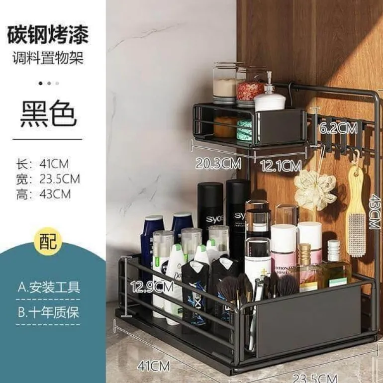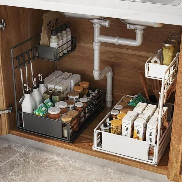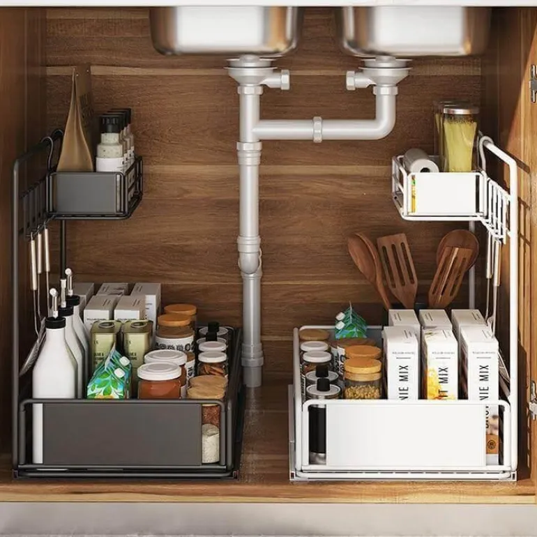 Maximieren Sie Ihren Stauraum unter der Spüle mit diesem stilvollen und langlebigen Organizer, der Ihre Küchen- und Badezimmerutensilien übersichtlich hält. Dieses mehrstufige Regal bietet eine praktische Lösung, um Ihre Arbeitsflächen aufzuräumen und Platz für Backzubehör, Recyclingbehälter und andere Gegenstände zu schaffen, die einen festen Platz benötigen.