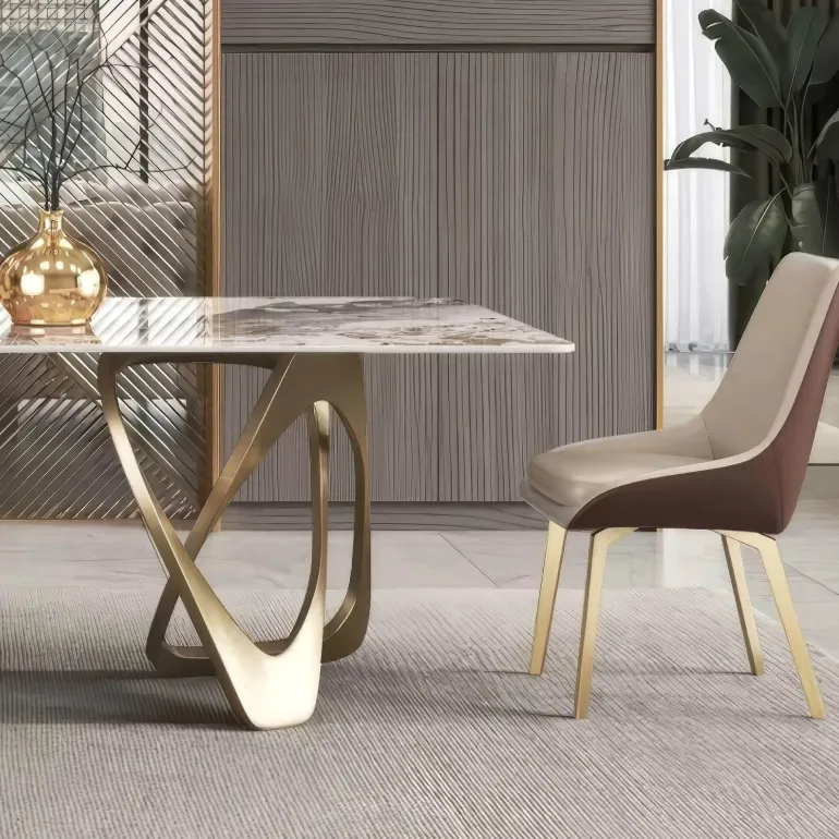Veredeln Sie Ihr kulinarisches Erlebnis mit diesem eleganten Esstisch aus Holz, der Schönheit und Funktionalität mühelos vereint. Der Tisch verfügt über eine atemberaubende Marmorplatte, die Eleganz ausstrahlt und zu verschiedenen Einrichtungsstilen passt. Sein markantestes Merkmal sind die kunstvoll gedrehten goldenen Tischbeine, die einen kunstvollen Sockel bilden, der nicht nur optisch aufwertet, sondern auch für Gesprächsstoff unter den Gästen sorgt.