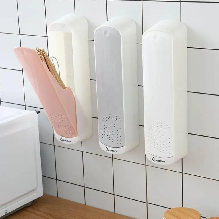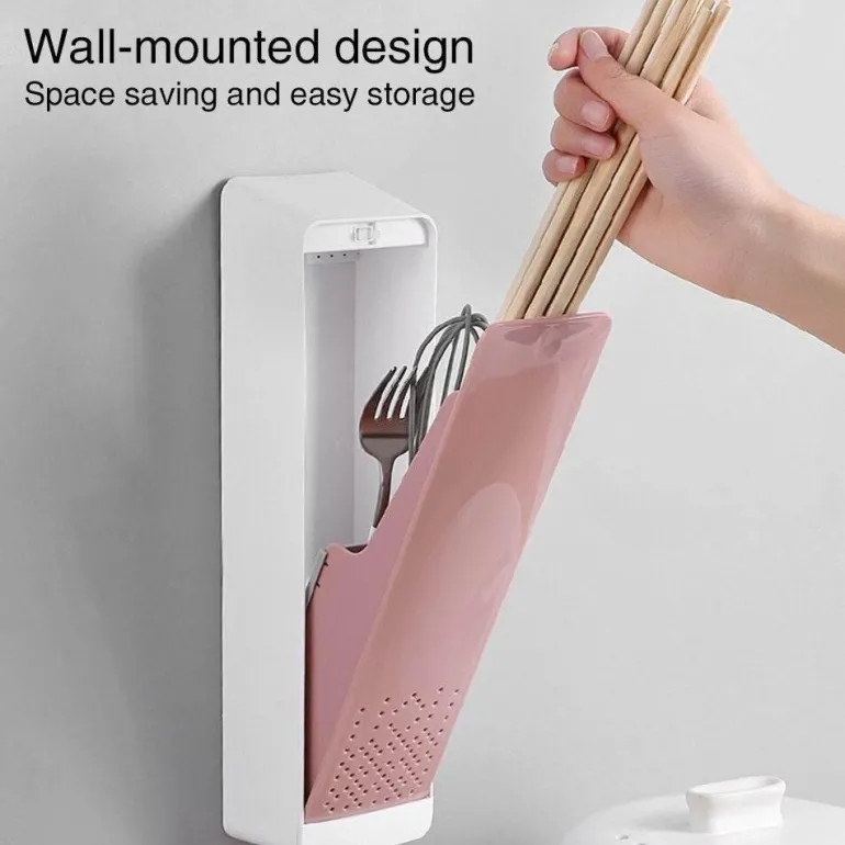 Entdecken Sie mit diesem innovativen Besteck-Organizer zur Wandmontage eine praktische Lösung für Ihre Aufbewahrungsbedürfnisse in der Küche. Das kompakte Design vereint Aufbewahrungs-, Abtropf- und Aufhängefunktionen und ist ideal, um Ihre Utensilien wie Löffel, Essstäbchen und Gabeln ordentlich und griffbereit aufzubewahren.