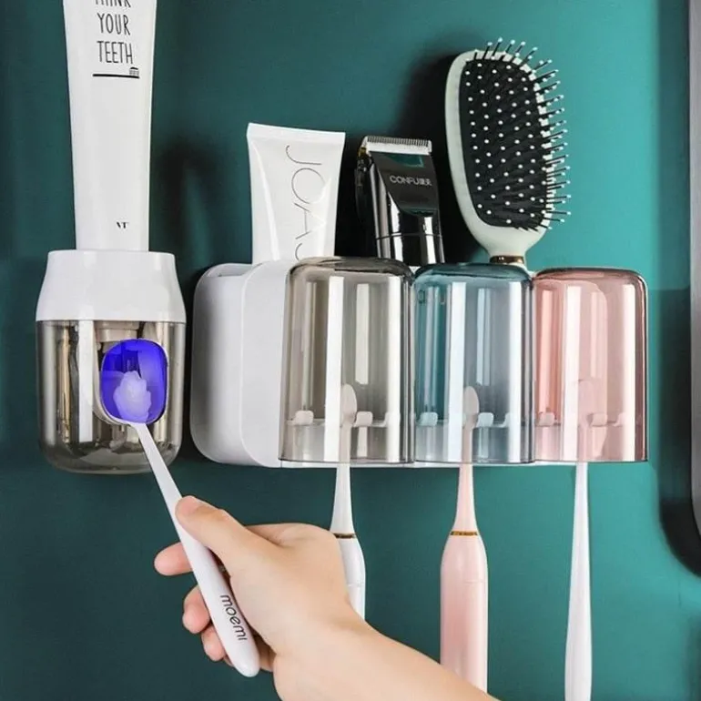 Mit einer integrierten Ablage für Zahnpasta und andere Kleinigkeiten erleichtert dieser Halter nicht nur Ihre Morgenroutine, sondern wertet auch Ihr Badezimmer optisch auf. Sein modernes Design fügt sich nahtlos in jedes Ambiente ein, während die robuste Kunststoffkonstruktion für lange Haltbarkeit sorgt.
