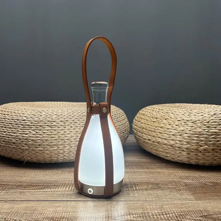 Verschönern Sie Ihr Ambiente mit dieser elegant gestalteten Weinflaschenlampe, die sich perfekt für den Einsatz am Bett und im Freien eignet. Die Lampe aus robustem Glas und weichem Leder misst 11 x 30 cm und passt perfekt zu verschiedenen Einrichtungsstilen.