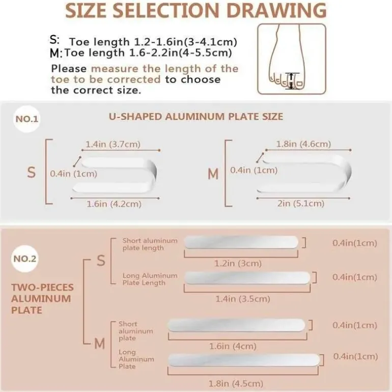 * **Verstellbarer Aluminiumstab**: Jede Zehenschiene verfügt über einen flexiblen Aluminiumstab, der sich leicht an die Zehenspitze anpassen lässt und so sicher von der Zehenspitze bis zum Gelenk sitzt. Diese Anpassung gewährleistet einen festen Sitz, der Ihren individuellen Bedürfnissen entspricht.