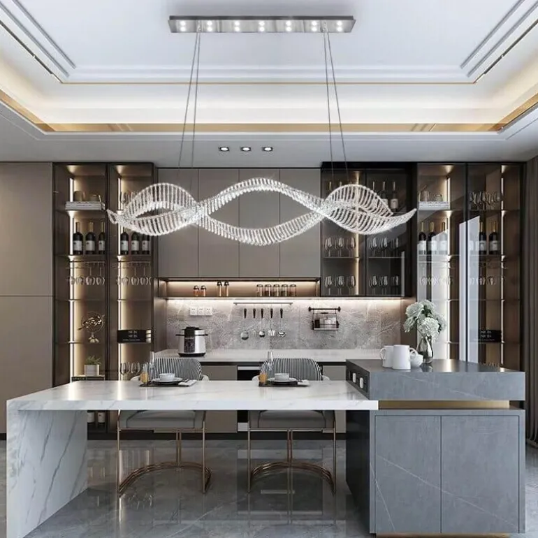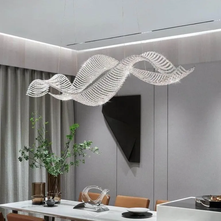 Wir präsentieren eine raffinierte Leuchte, die moderne Eleganz mit einem Hauch von Opulenz verbindet. Das gewellte Kristalldesign dieses Kronleuchters fängt das Licht wunderschön ein und bricht es. So entsteht ein faszinierendes Schauspiel, das jeden Raum in eine Oase des Luxus verwandelt. Inspiriert von der anmutigen Bewegung der Meereswellen bietet dieses Stück mehr als nur Beleuchtung; es sorgt für ein einzigartiges Erlebnis.