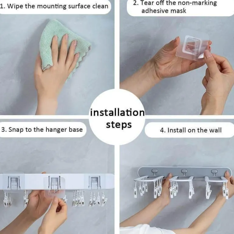 Dank seines durchdachten Klappdesigns lässt sich dieser Wäscheständer bei Nichtgebrauch leicht verstauen und fügt sich nahtlos in Ihr Zuhause ein. Die Montage ist unkompliziert – weder Nägel noch Klebstoff sind erforderlich, sodass Sie ihn aufstellen können, ohne Ihre Wände zu beschädigen. Einfach abziehen und aufkleben für sicheren Halt.