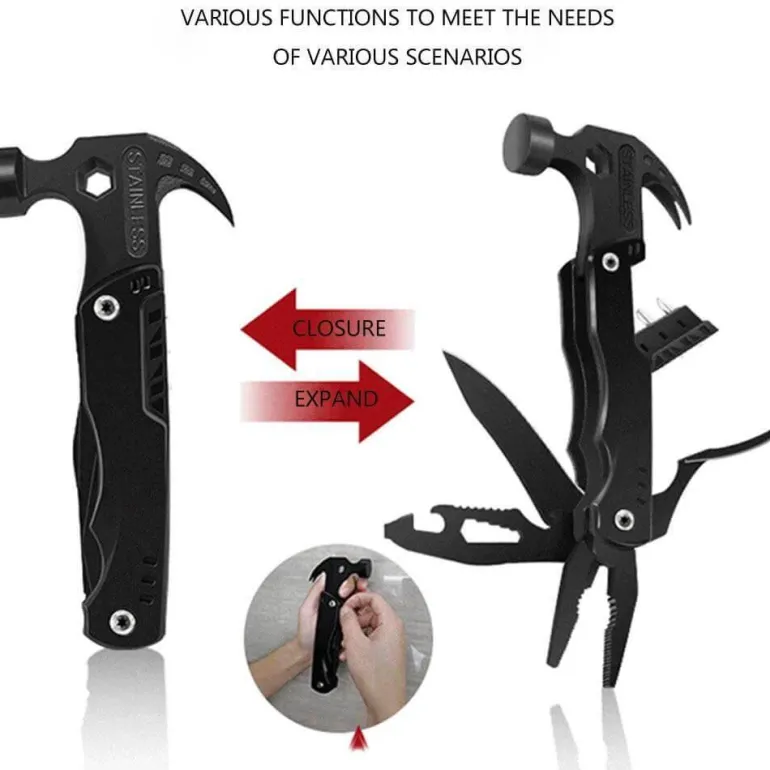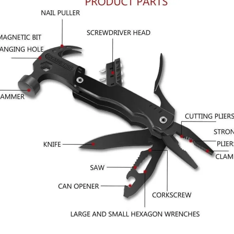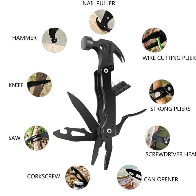 Zu den wichtigsten Funktionen gehören ein Hammer zum Einschlagen von Nägeln, ein scharfes Messer zum Schneiden und eine robuste Säge für die Holzbearbeitung. Mit dem praktischen Dosenöffner können Sie bequem an Ihre Lebensmittel gelangen, während große und kleine Sechskantschlüssel vielseitige Anwendungsmöglichkeiten bieten. Der Korkenzieher bietet zudem eine praktische Lösung zum Öffnen von Flaschen, und die Klemme bietet sicheren Halt für verschiedene Aufgaben. Eine robuste Zange erleichtert das Greifen und Biegen, während sich eine Schneidzange perfekt für die Handhabung von Draht und härteren Materialien eignet. Der Schraubendreherkopf eignet sich für Befestigungselemente, und der Nagelzieher vereinfacht das Entfernen von Nägeln.
