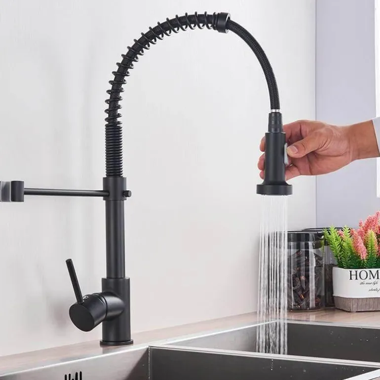 Diese Küchenarmatur mit Sprühfunktion aus massivem Messing ist langlebig und zuverlässig und zeichnet sich durch hohe Korrosions- und Verschleißfestigkeit aus. Der um 360° schwenkbare Auslauf mit flexibler Feder ermöglicht es Ihnen, jeden Winkel Ihrer Spüle mühelos zu erreichen. Genießen Sie die Vielseitigkeit der zwei Sprühfunktionen – wechseln Sie einfach mit dem praktischen Knopf am Auslauf zwischen Sprüh- und Strahlmodus. Die Einstellung von Wassertemperatur und -durchfluss erfolgt ganz einfach über den Einhebelhebel und ist somit benutzerfreundlich.