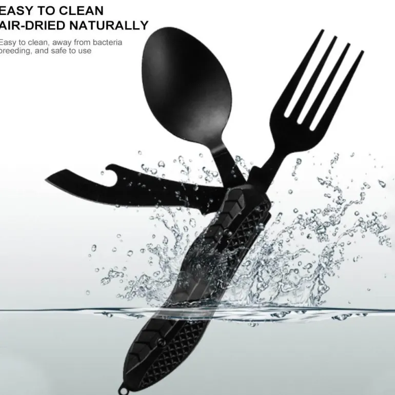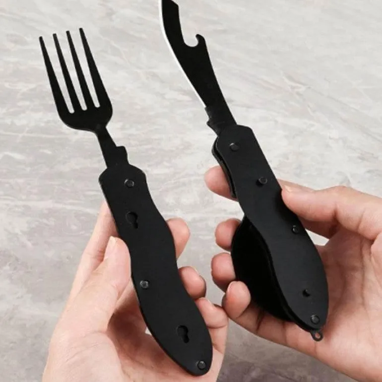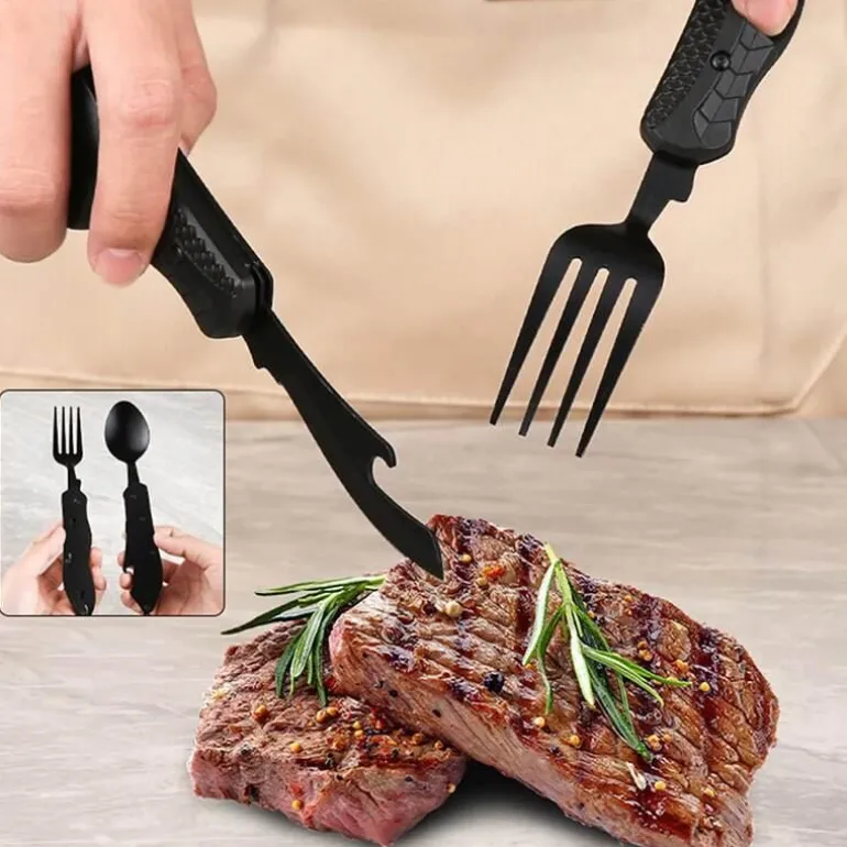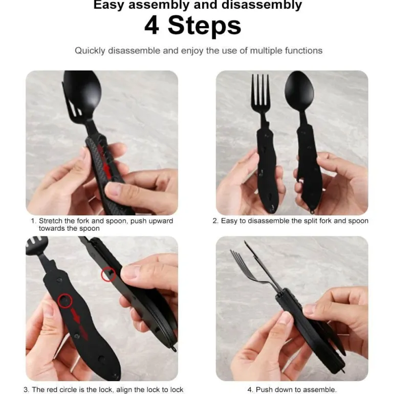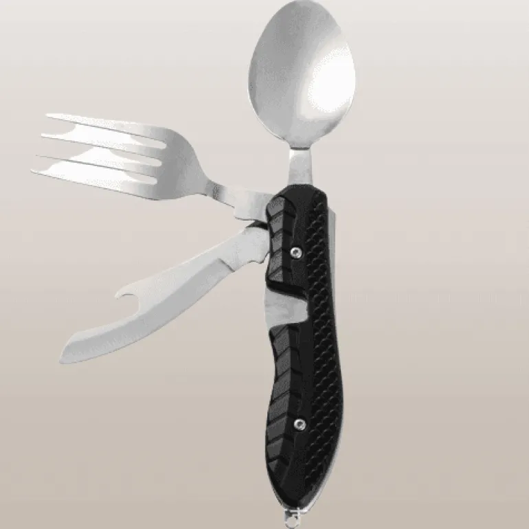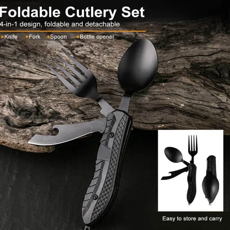 Erleben Sie den Komfort unseres tragbaren 4-in-1-Reisebesteck-Sets – durchdacht konzipiert für müheloses Essen, egal wohin Ihre Abenteuer Sie führen. Dieses kompakte Besteck vereint Gabel, Messer, Löffel und Dosenöffner in einem eleganten Gerät und ist somit ein unverzichtbarer Begleiter für Mahlzeiten unterwegs.