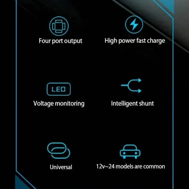 Das digitale 4-Port-Schnellladegerät für den Zigarettenanzünder ist ideal für moderne Fahrer, die unterwegs effizient Multitasking benötigen. Dank seines schlanken Designs können Sie bis zu vier Geräte gleichzeitig mit Strom versorgen. So können Sie Ihr Smartphone, Tablet und andere USB-Geräte auf langen Fahrten oder im Alltag laden. Die integrierte Digitalanzeige überwacht die Spannung und Stromstärke in Echtzeit und sorgt so für optimale Ladebedingungen. Dank seines kompakten und leichten Designs passt es perfekt in den Zigarettenanzünder Ihres Fahrzeugs und spart so Platz und Ordnung.
