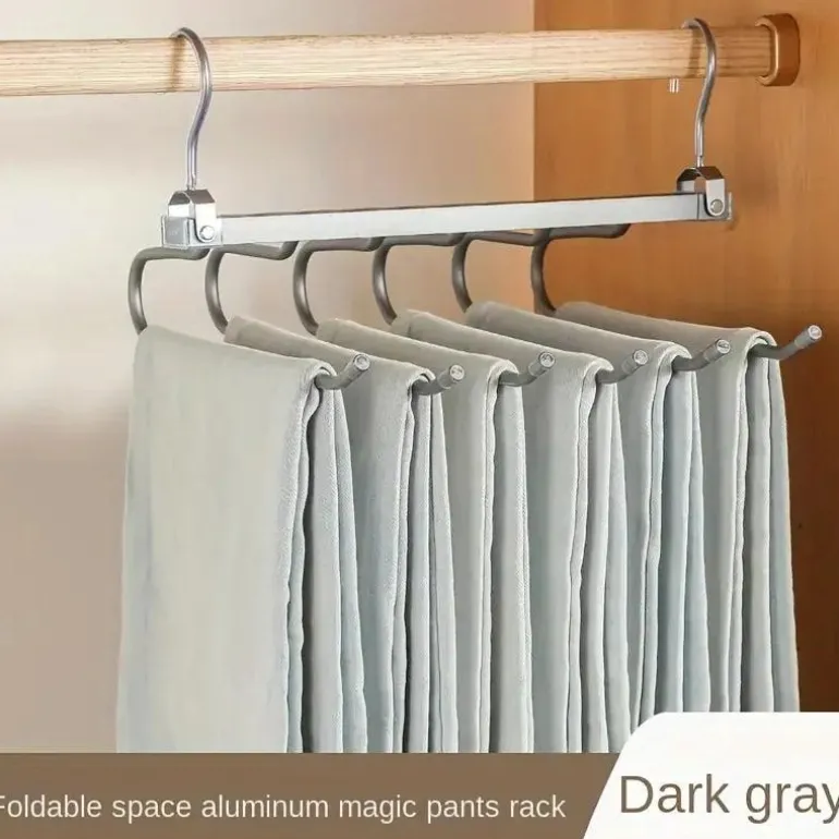 Halten Sie Ihre Kleidung sauber und geordnet und sparen Sie gleichzeitig wertvollen Platz mit diesem drehbaren, zusammenklappbaren 6-in-1-Hosenbügel, ein Muss für jede Garderobe zu Hause oder auf Reisen!