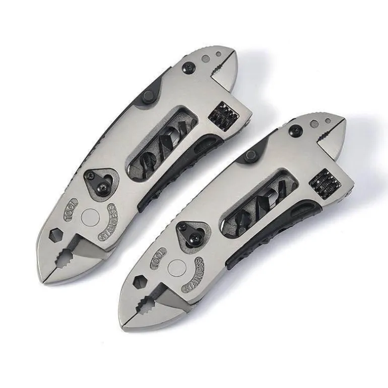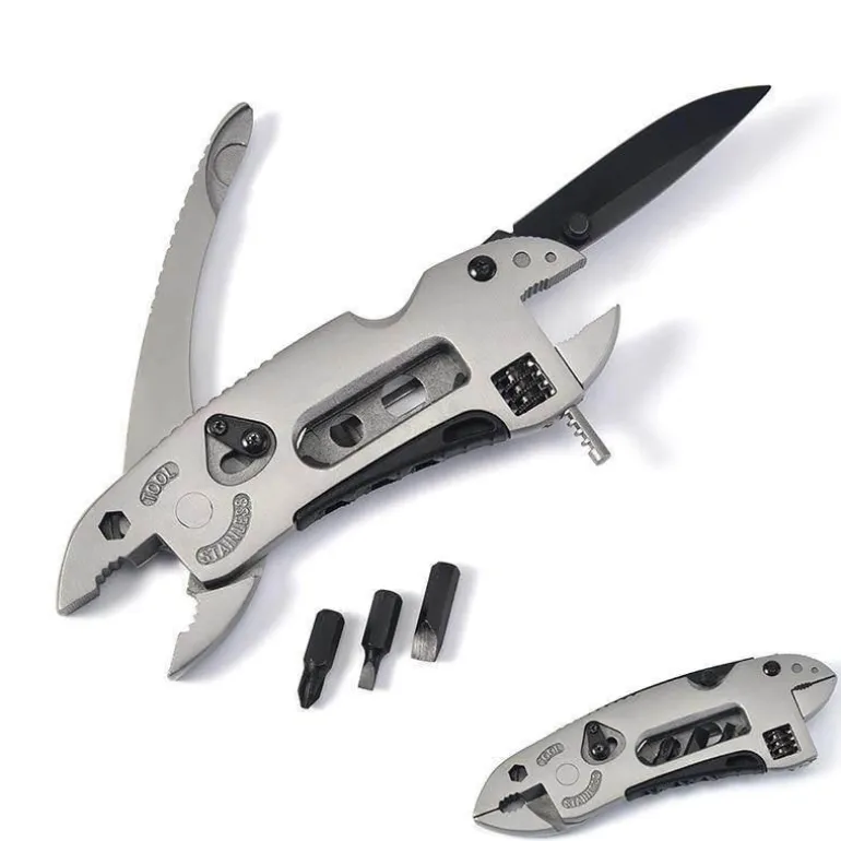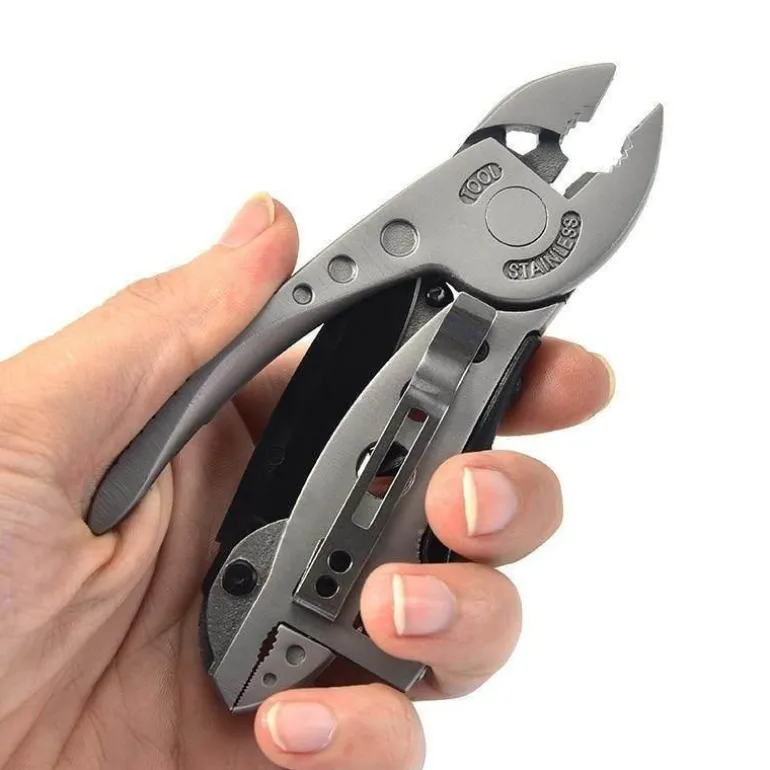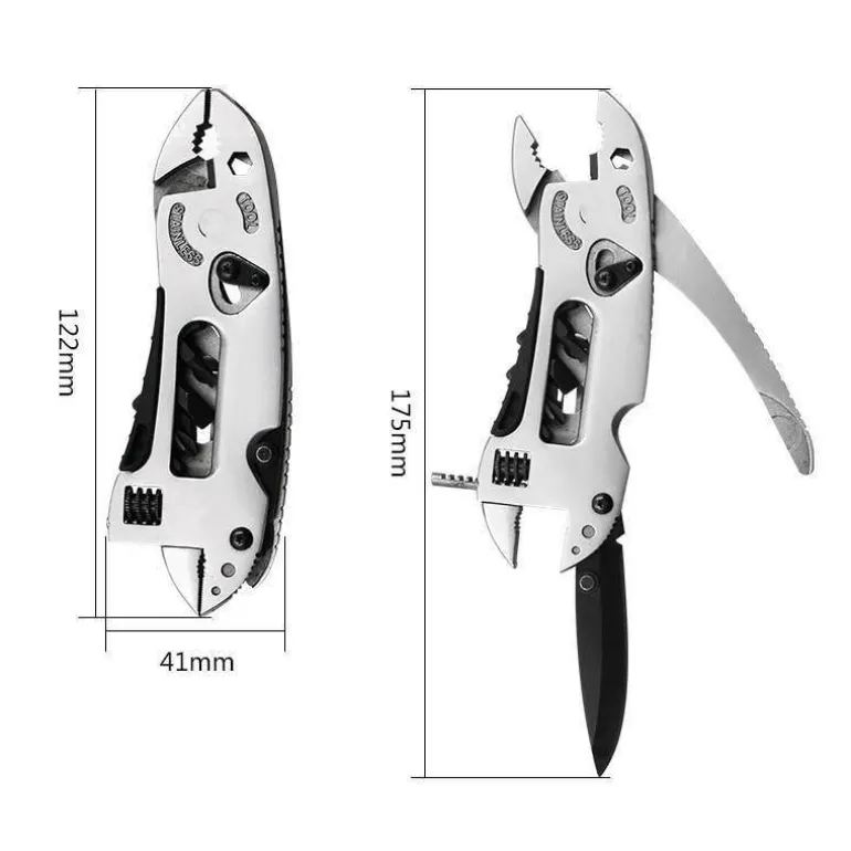 Dieses Werkzeug erfüllt mehrere Funktionen und kann als Messer, Zange, Schraubenschlüssel, Schraubenzieher oder Drahtschneider verwendet werden. Damit ist es eine unverzichtbare Ergänzung für Ihren Werkzeugkasten.