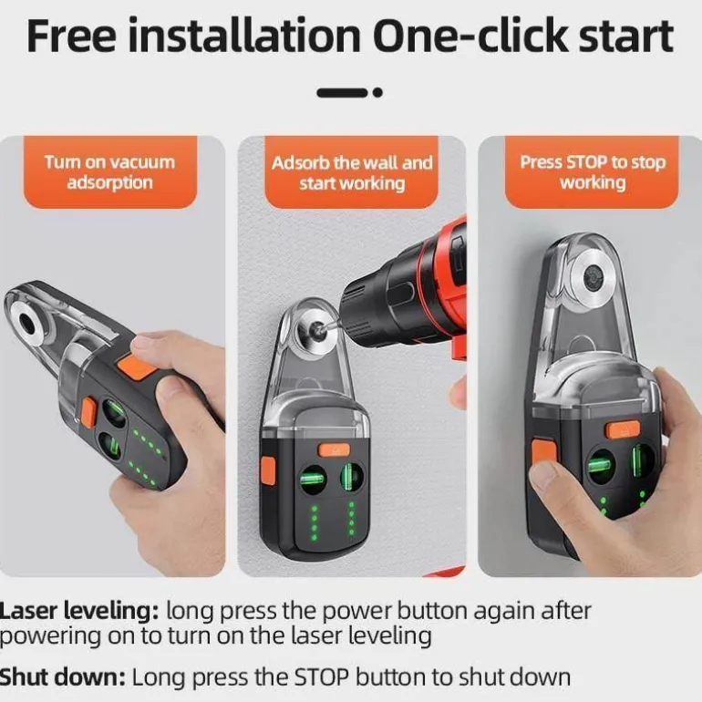 Für zusätzlichen Komfort ermöglicht die L-förmige Wandhalterung eine einfache Einrichtung des Laser-Nivelliergeräts. Legen Sie das Gerät einfach auf eine ebene Fläche, drücken Sie kurz die Saugtaste und sichern Sie die Dichtung für die automatische Saugwirkung auf verschiedenen Oberflächen, darunter Keramik, Wände und Holzmöbel. Die L-Halterung dient gleichzeitig als Wandhalterung mit einer Tragkraft von bis zu 5 kg.