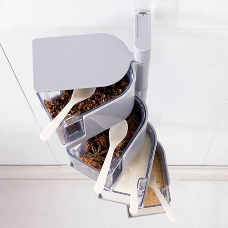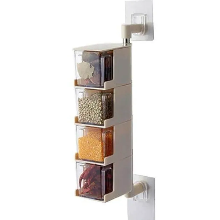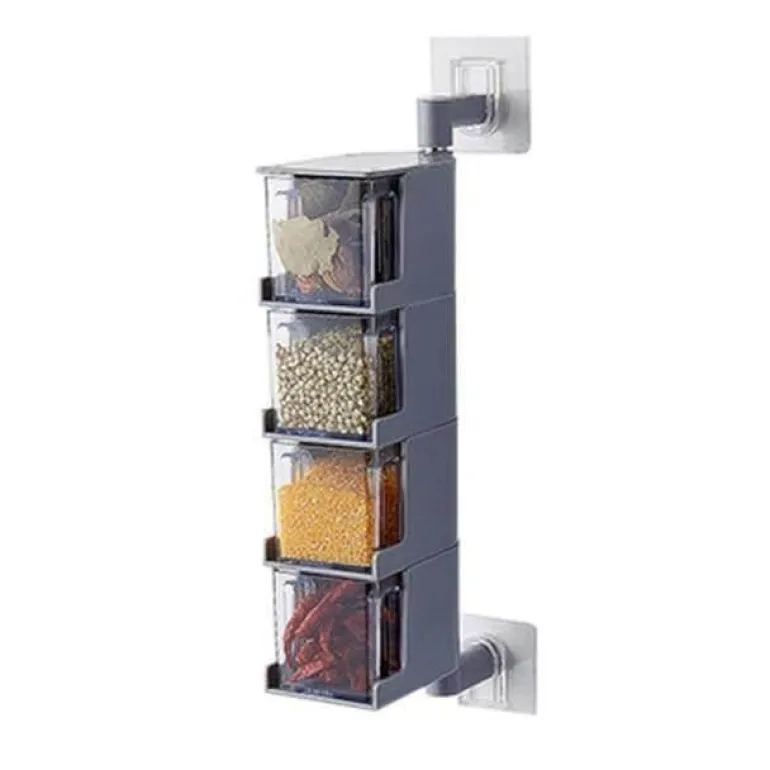 Verbessern Sie Ihre Küchenorganisation mit diesem effizienten, wandmontierten Gewürz-Organizer mit innovativem Drehmechanismus und mehrschichtigen Aufbewahrungsboxen. Hergestellt aus langlebigem, hochwertigem ABS-Kunststoff und Edelstahl, schützt dieser hygienische und geruchsneutrale Behälter Ihre Gewürze und Würzmittel vor Staub und Bakterien. Das clevere 4-Ebenen-Design bietet vier separate Gewürzbehälter, ideal für die Aufbewahrung verschiedenster Gewürze.