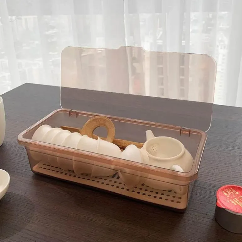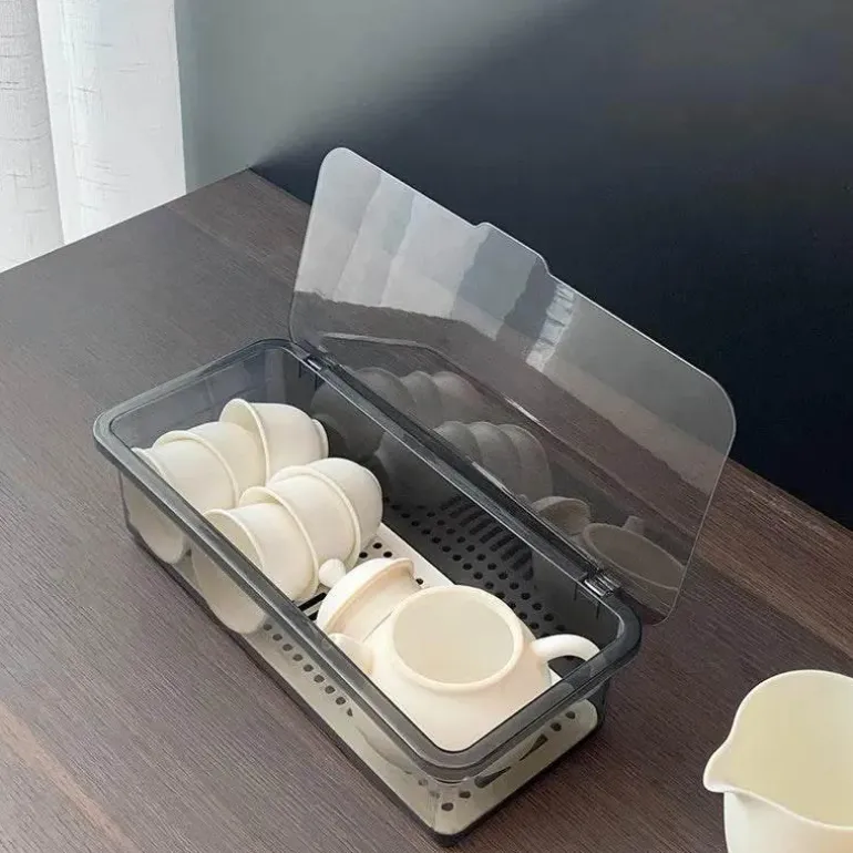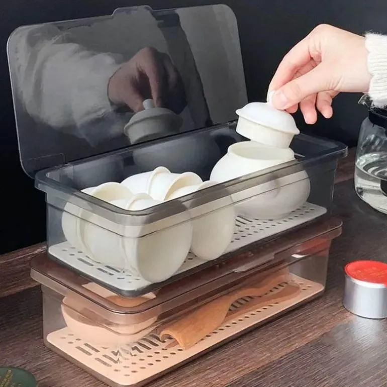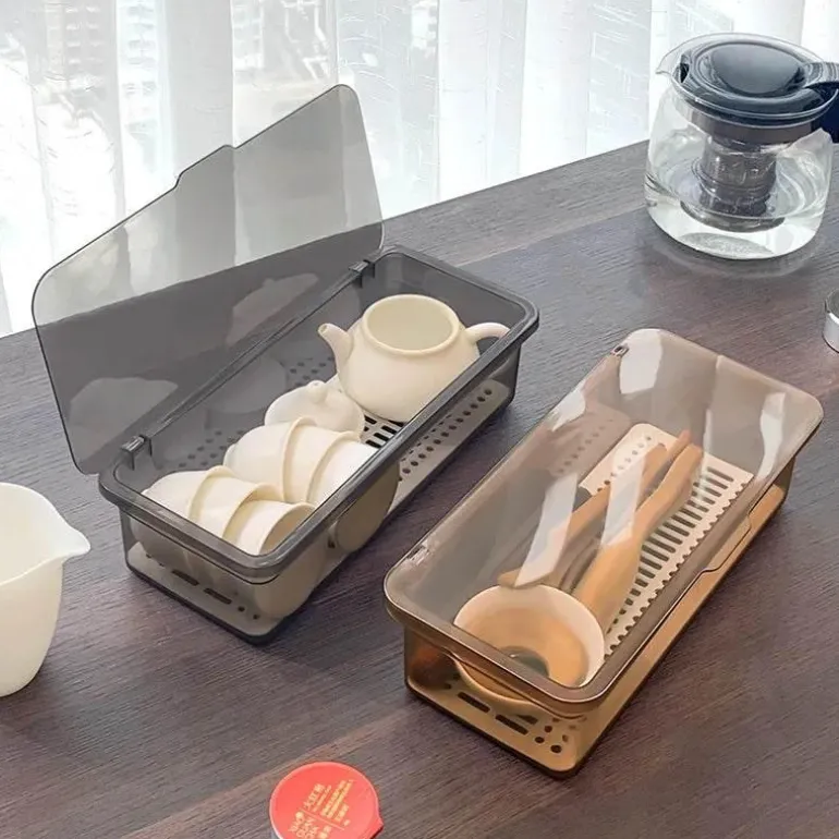 Wir präsentieren den eleganten Teeservice-Organizer, eine sorgfältig gestaltete Aufbewahrungslösung mit Deckel und Löffel, die Ihre Teeutensilien schön geordnet hält. Hergestellt aus hochwertigem Polypropylen (PP) besticht dieser Organizer durch seine moderne Ästhetik, die durch die glänzende Oberfläche und die schlanke rechteckige Form hervorgehoben wird und jeden Raum bereichert.