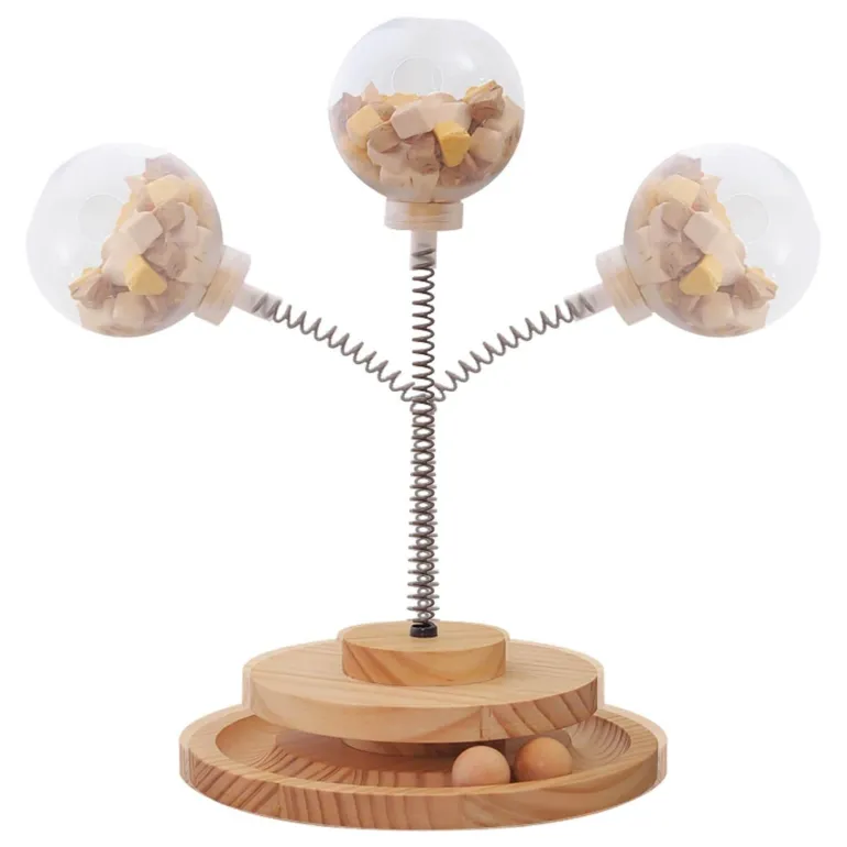 Der Puzzle Tumbler ist aus hochwertigen Materialien gefertigt und besteht aus robustem Holz, ergänzt durch eine robuste Metallfeder und einen stabilen PP-Futterball. Diese Kombination sorgt für dauerhafte Leistung, da die Feder nach dem Anstoßen durch Ihr Haustier schnell wieder in ihre ursprüngliche Form zurückkehrt.
