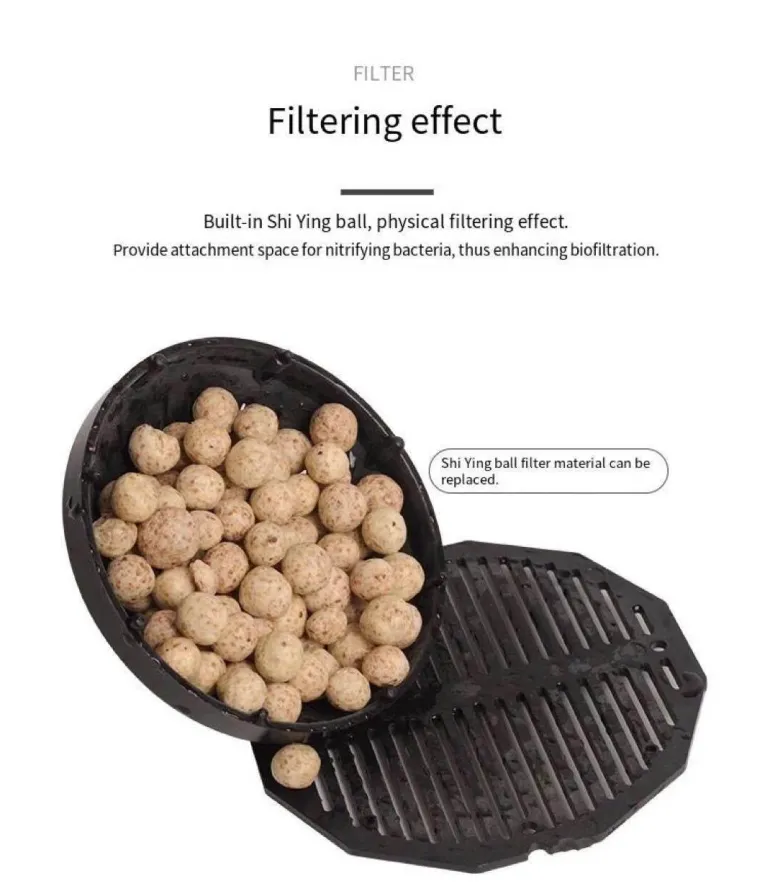 Der Boden des Zylinders verfügt über eine biologische Filterkugel, die das Wachstum nützlicher nitrifizierender Bakterien fördert, die für die Aufrechterhaltung des Stickstoffkreislaufs in Ihrem Aquarium unerlässlich sind.