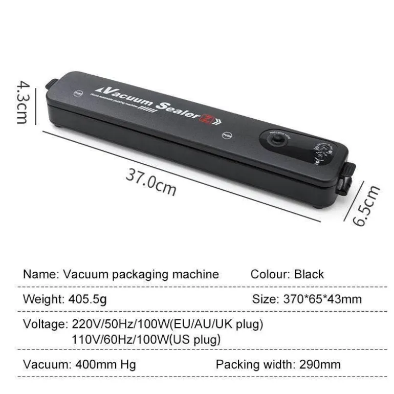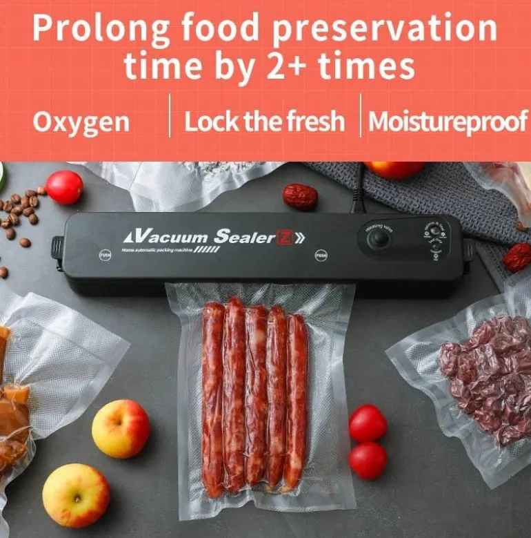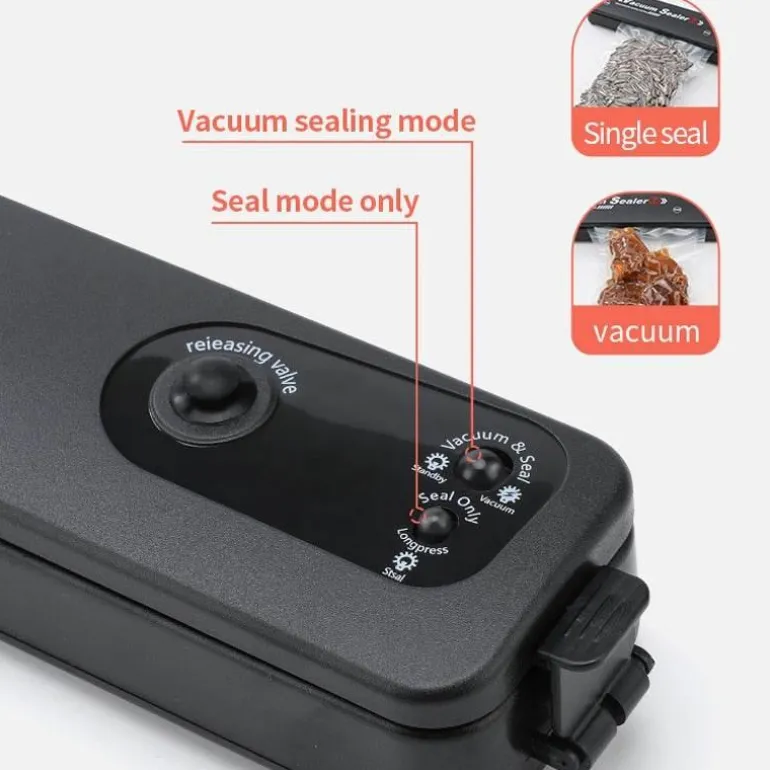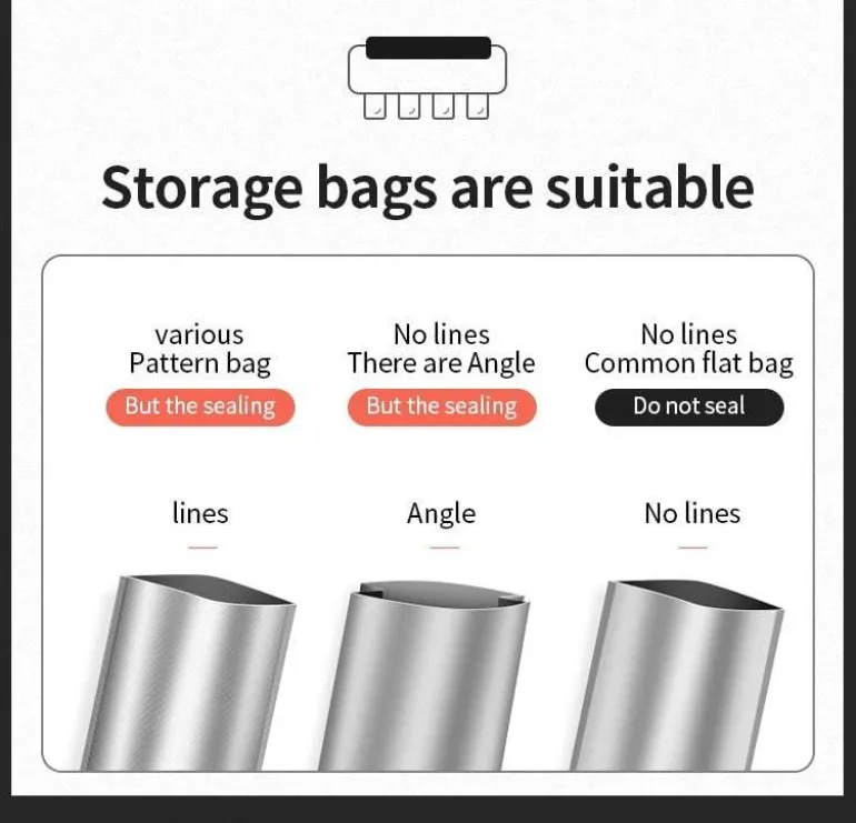 Dieses vielseitige Gerät eignet sich ideal für eine Vielzahl trockener Lebensmittel, ist jedoch nicht zum Vakuumieren von Flüssigkeiten, Ölen oder wasserbasierten Produkten geeignet. Im Gegensatz zu vielen kleinen automatischen Vakuumierern, die spezielle einseitige Vakuumbeutel für optimale Leistung benötigen, ist dieses Modell so konzipiert, dass es mit den entsprechenden Vakuumbeuteln effizient arbeitet und eine vollständige Versiegelung erzielt. Herkömmliche flache und glatte Beutel können nur ohne Vakuumierung versiegeln.