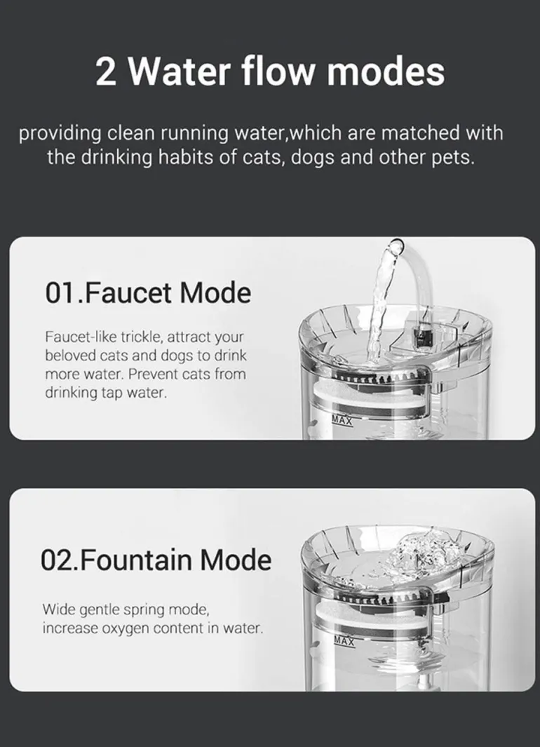 Mit einem großzügigen Fassungsvermögen von 1,8 Litern reduziert dieser Trinkbrunnen den Bedarf an häufigem Wassernachfüllen und deckt den Flüssigkeitsbedarf von Katzen, Hunden, Vögeln und anderen Haustieren jeder Größe. Sie können beruhigt sein, denn Ihre Haustiere haben auch während Ihrer Arbeit Zugang zu frischem, fließendem Wasser. Mit zwei verschiedenen Wasserflussmodi – Wasserhahnmodus und Springbrunnenmodus – trägt dieser Spender dazu bei, dass Ihre Haustiere glücklich und gesund bleiben.