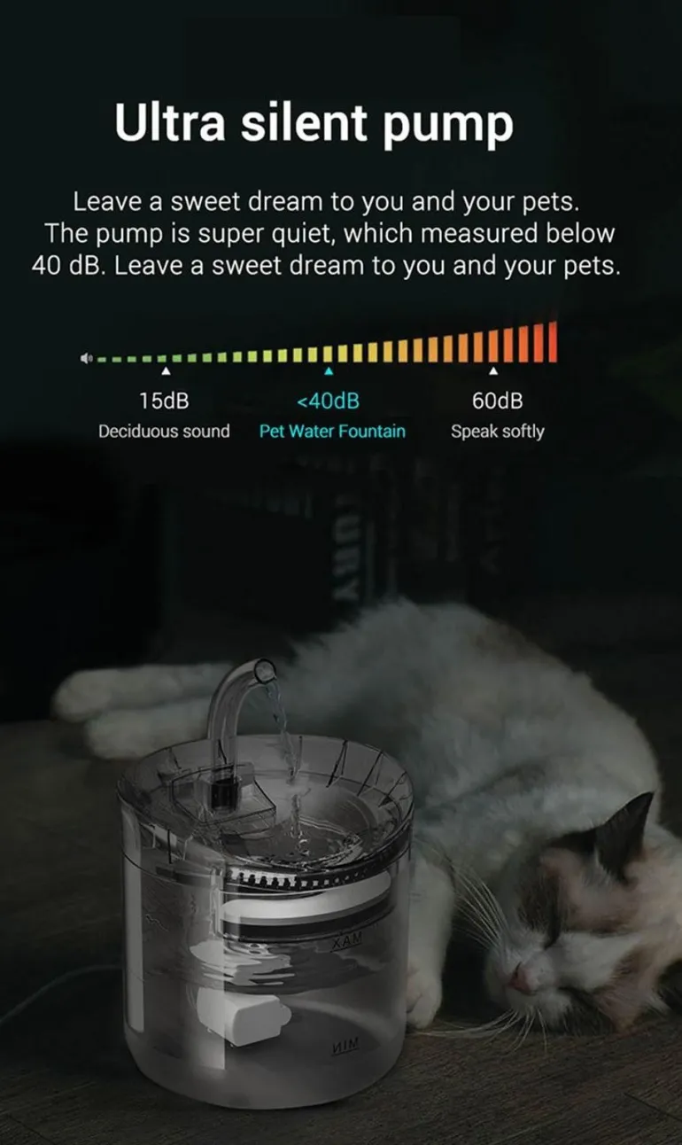 Dieser Brunnen ist mit einer speziell entwickelten Silent Pump ausgestattet, die mithilfe eines speziellen Saugnapfs die Geräuschentwicklung minimiert und so für eine ruhige Umgebung für Sie und Ihre Haustiere sorgt.