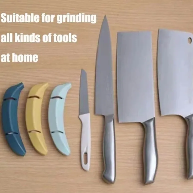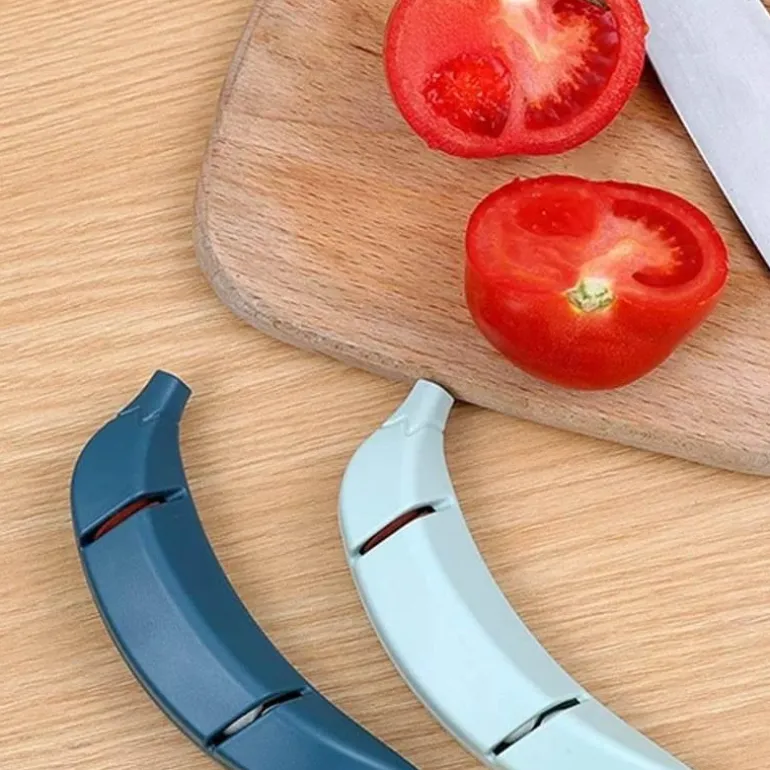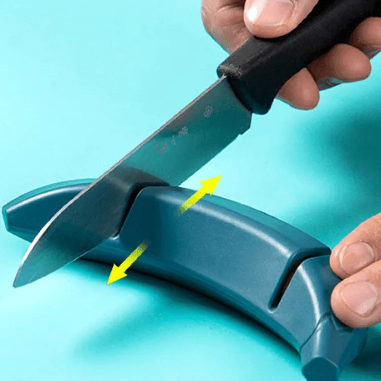 Die Anwendung des Schärfers ist einfach und effektiv. Der Bananenkörper verfügt über zwei Schleifknoten, mit denen Sie Ihre Messer mühelos durch Reibung schärfen können.