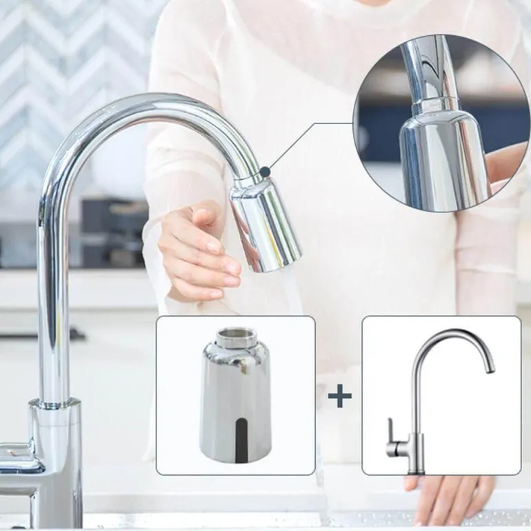 Entdecken Sie den automatischen berührungslosen Sensor-Wasserhahnkopf für eine nahtlose, freihändige Bedienung in Ihrer Küche. Dieser innovative Wasserhahnkopf erleichtert Ihren Alltag durch müheloses Wassermanagement, ohne dass Sie den Wasserhahn berühren müssen. Das kompakte Design vereinfacht die Installation und macht die Integration dieses funktionalen Features in Ihr Zuhause einfach.