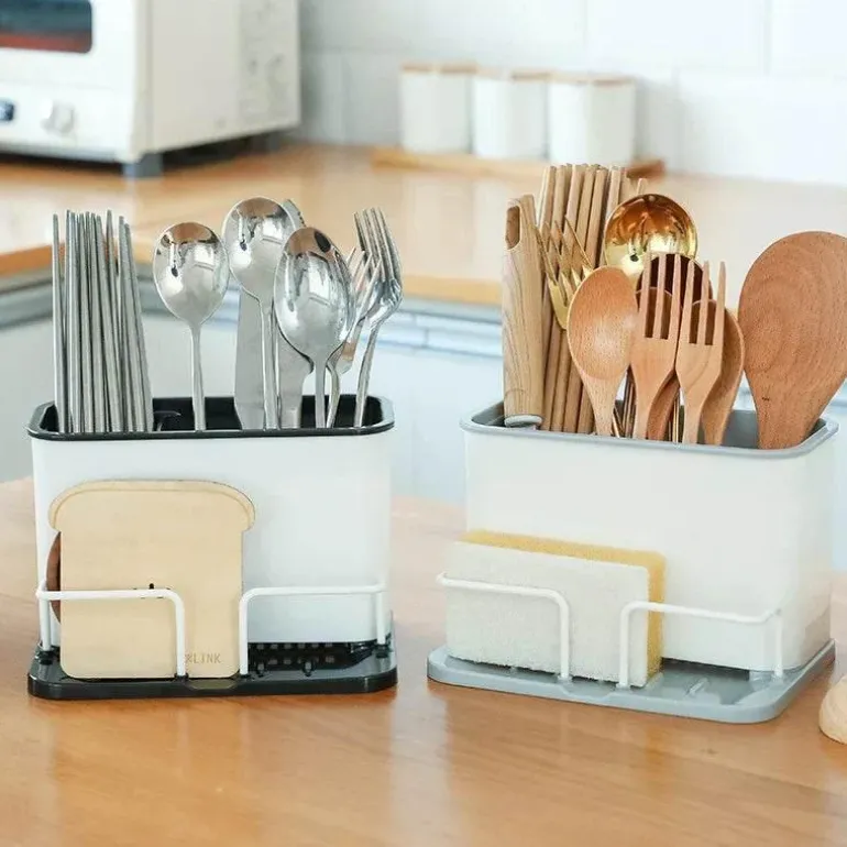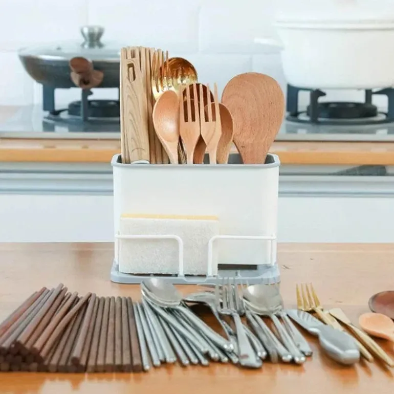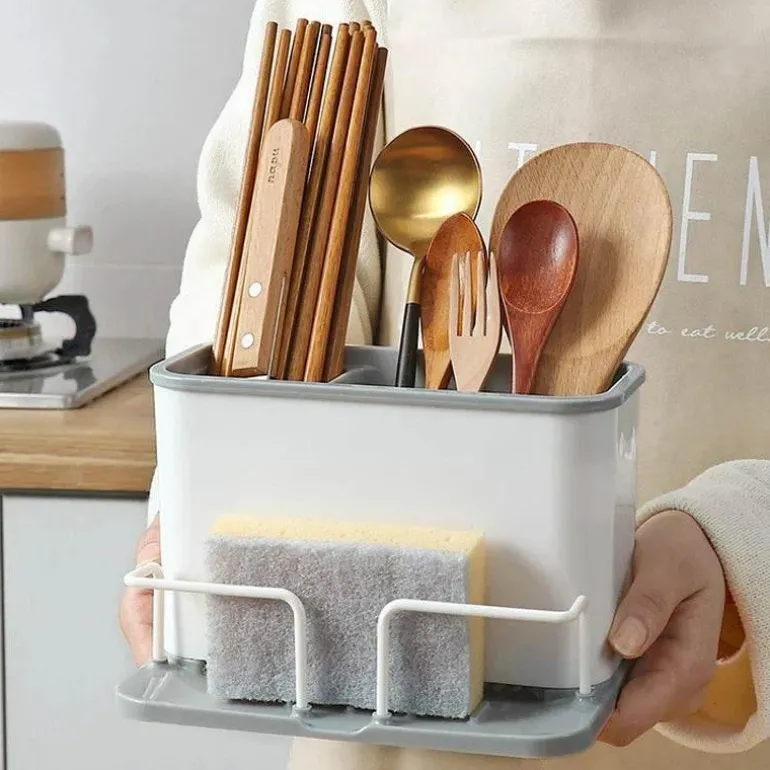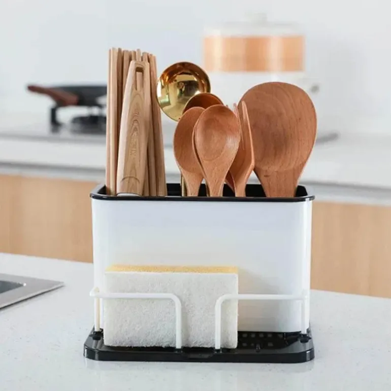 Mit diesem innovativen Besteck- und Schwammhalter sorgen Sie für Ordnung und Stil in Ihrer Küche. Dieser praktische Abtropfständer mit Doppelgitter erweitert Ihren Stauraum und sorgt gleichzeitig für Ordnung auf der Arbeitsfläche.